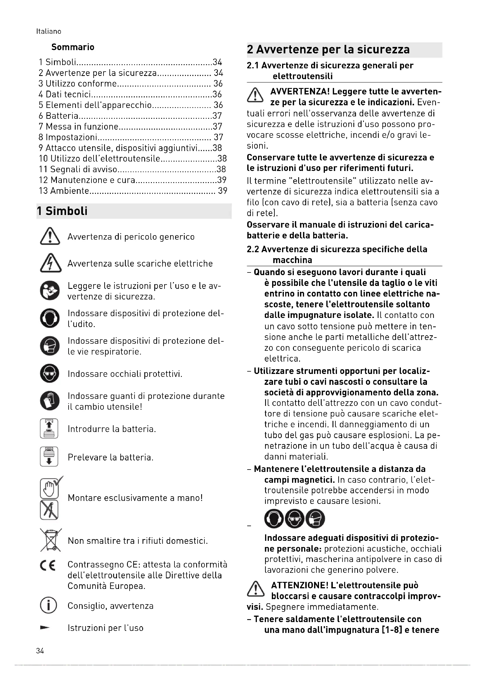elettroutensili AVVERTENZA! Leggere tutte le avverten ze per la sicurezza e le indicazioni. Even tuali errori nell'osservanza delle avvertenze di sicurezza e delle istruzioni d'uso possono pro vocare scosse elettriche, incendi e/o gravi le sioni. Conservare tutte le avvertenze di sicurezza e le istruzioni d'uso per riferimenti futuri. Il termine "elettroutensile" utilizzato nelle av vertenze di sicurezza indica elettroutensili sia a filo (con cavo di rete), sia a batteria (senza cavo di rete). Osservare il manuale di istruzioni del carica batterie e della batteria.