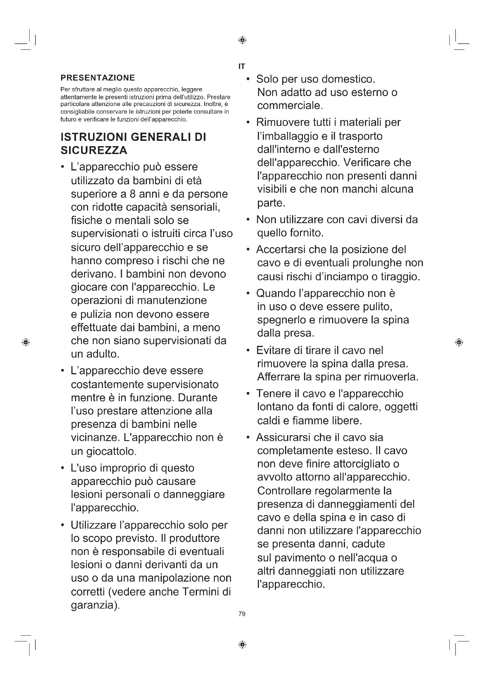 - Assicurarsi che il cavo sia completamente esteso. Il cavo non deve nire attorcigliato o avvolto attorno all'apparecchio. Controllare regolarmente la presenza di danneggiamenti del cavo e della spina e in caso di danni non utilizzare l'apparecchio se presenta danni, cadute sul pavimento o nell'acqua o altri danneggiati non utilizzare l'apparecchio.80
