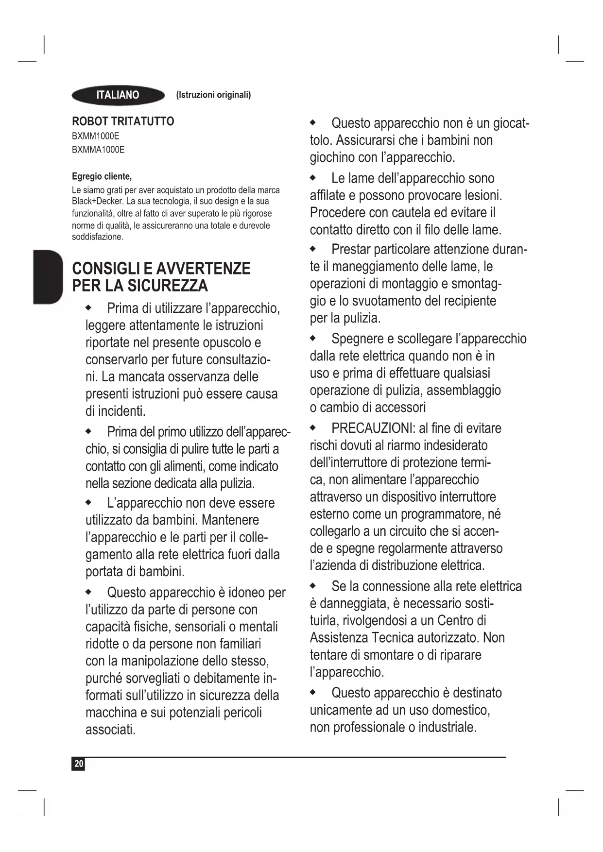 ROBOT TRITATUTTO BXMM1000E BXMMA1000E Egregio cliente, Le siamo grati per aver acquistato un prodotto della marca Black+Decker. La sua tecnologia, il suo design e la sua funzionalità, oltre al fatto di aver superato le più rigorose norme di qualità, le assicureranno una totale e durevole soddisfazione.