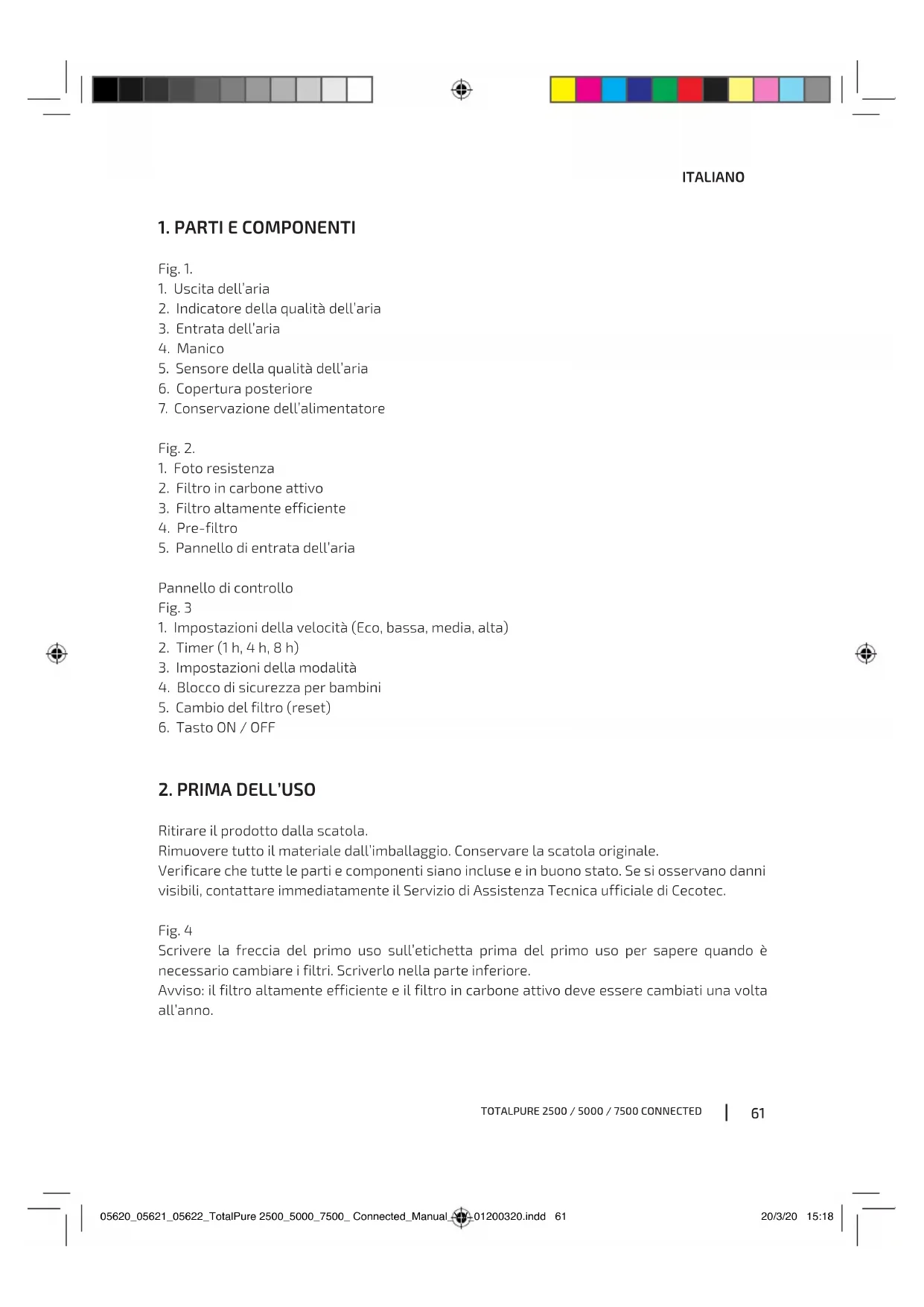 Ritirare il prodotto dalla scatola. Rimuovere tutto il materiale dall’imballaggio. Conservare la scatola originale. Verificare che tutte le parti e componenti siano incluse e in buono stato. Se si osservano danni visibili, contattare immediatamente il Servizio di Assistenza Tecnica ufficiale di Cecotec. Fig. 4 Scrivere la freccia del primo uso sull’etichetta prima del primo uso per sapere quando è necessario cambiare i filtri. Scriverlo nella parte inferiore. Avviso: il filtro altamente efficiente e il filtro in carbone attivo deve essere cambiati una volta all’anno. 05620_05621_05622_TotalPure 2500_5000_7500_ Connected_Manual_YV_01200320.indd 6105620_05621_05622_TotalPure 2500_5000_7500_ Connected_Manual_YV_01200320.indd 61 20/3/20 15:1820/3/20 15:18TOTALPURE 2500 / 5000 / 7500 CONNECTED