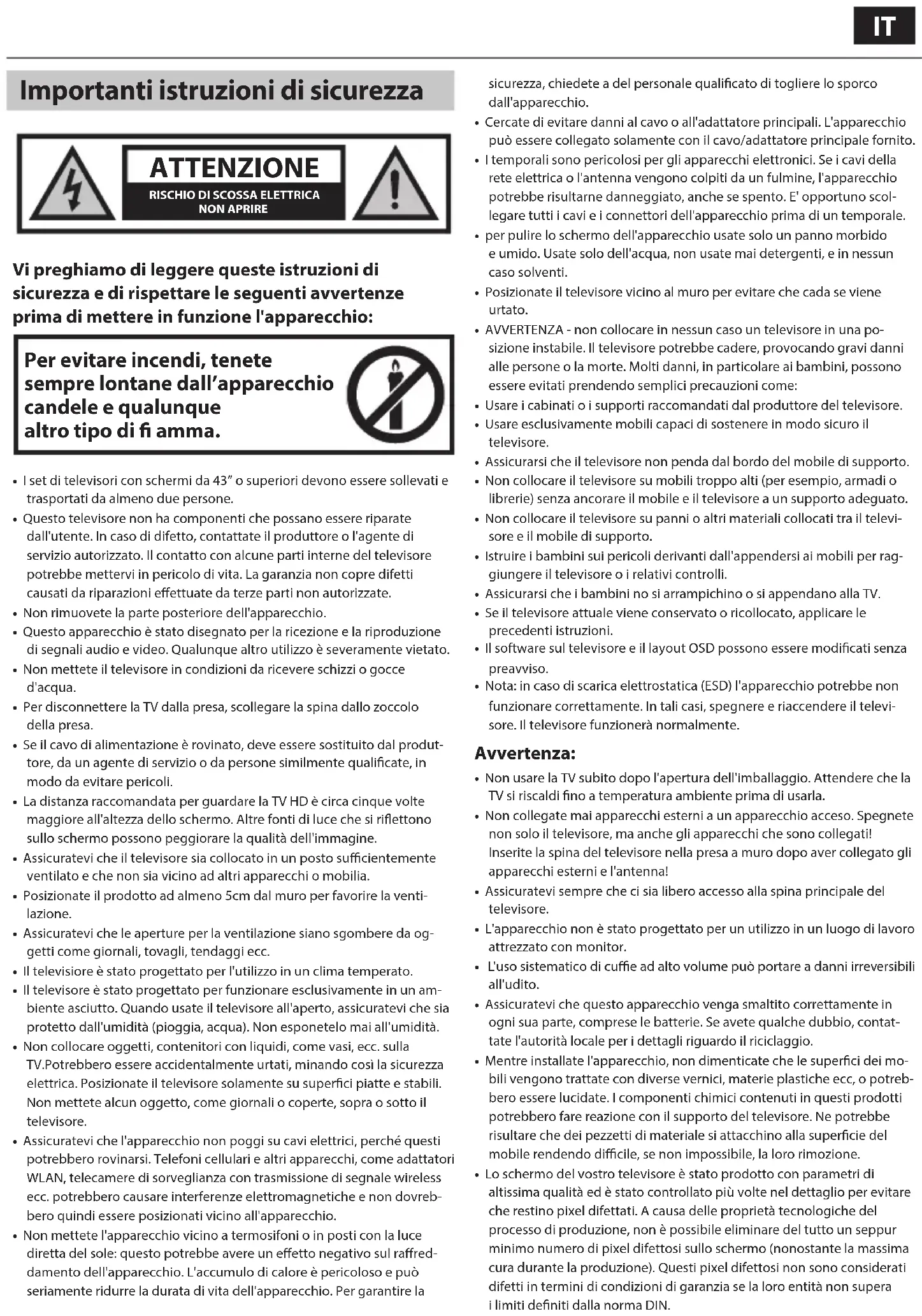 - AVVERTENZA - non collocare in nessun caso un televisore in una po- sizione instabile. Il televisore potrebbe cadere, provocando gravi danni alle persone o la morte. Molti danni, in particolare ai bambini, possono essere evitati prendendo semplici precauzioni come: