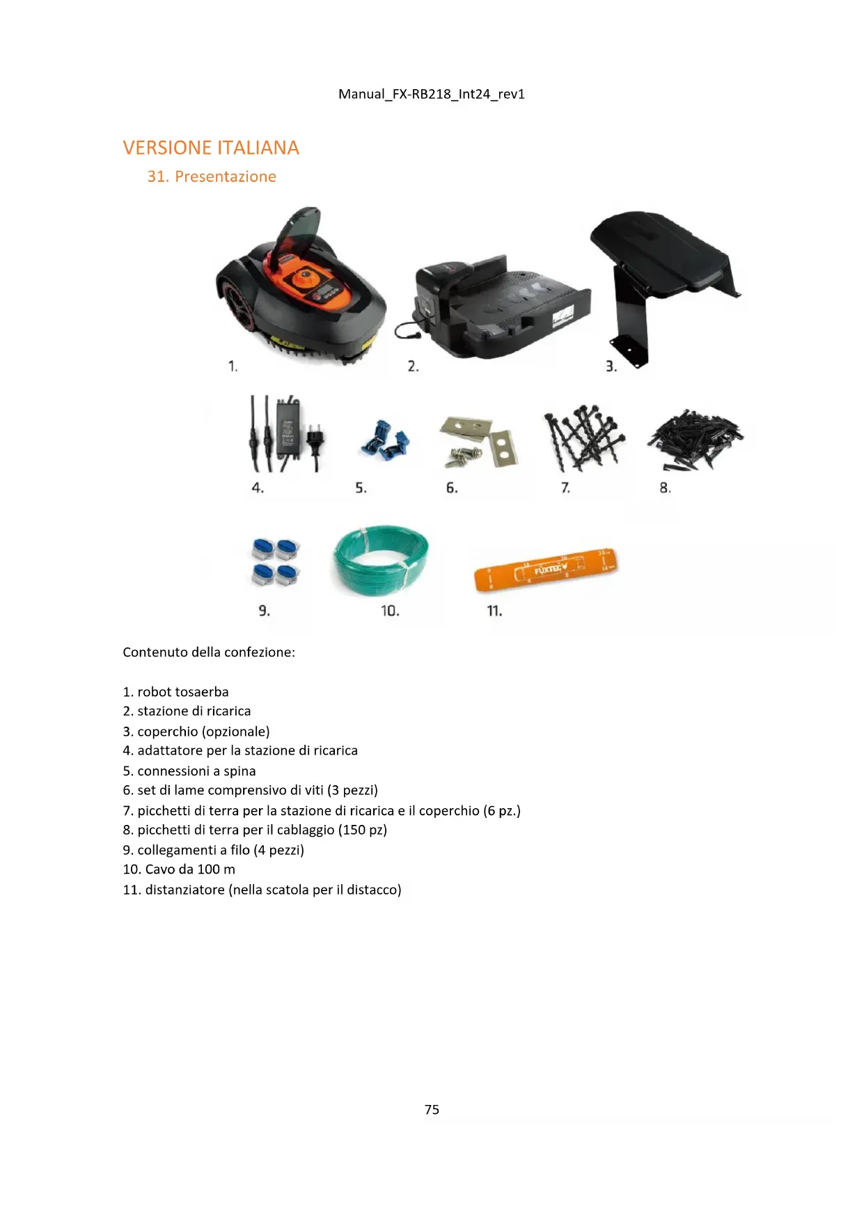 - Si consiglia di riporre il tosaerba robot e la stazione di ricarica in un luogo asciutto e al riparo dal gelo durante l'inverno, dopo aver rimosso l'erba e lo sporco (solo con un panno asciutto e un raschietto).Manual_FX-RB218_Int24_rev1