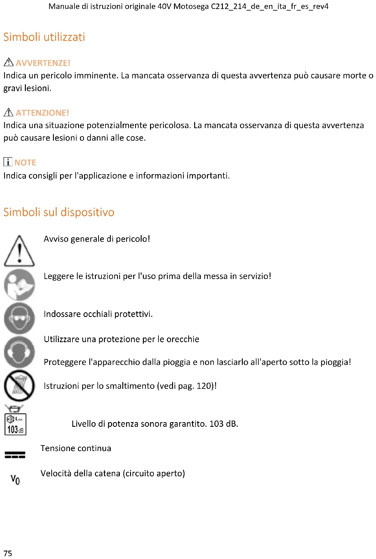 Uso previsto L’uso di questo dispositivo è esclusivamente, – per il taglio del legno e il taglio di alberi in ambito privato, – non adatto al taglio di plastica, muratura o materiali da costruzione diversi dal legno, – da utilizzare secondo le descrizioni e le indicazioni di sicurezza riportate in questo manuale d'uso.Manuale di istruzioni originale 40V Motosega C212_214_de_en_ita_fr_es_rev4