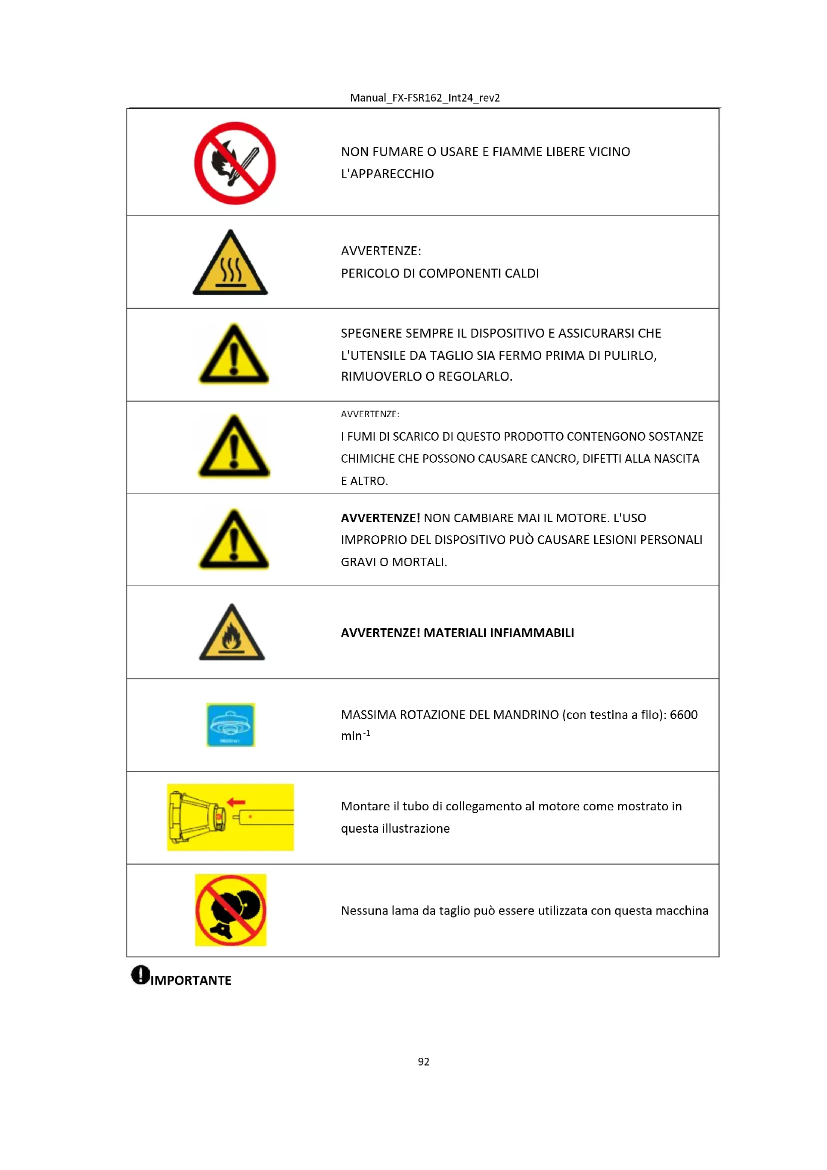 L'uso prolungato del dispositivo espone l'utente a shock che possono portare alla malattia del dito bianco (sindrome di Raynaud) o alla sindrome del tunnel carpale. Questa condizione riduce la capacità della mano di percepire e regolare la temperatura, provoca intorpidimento e sensazioni di calore e può portare a danni ai nervi e alla circolazione e alla morte dei tessuti. Non tutti i fattori che portano alla malattia del dito bianco sono noti, ma il freddo, il fumo e altre malattie che colpiscono i vasi sanguigni e la circolazione sanguigna, così come l'esposizione ampia o prolungata agli shock sono menzionati come fattori nello sviluppo della malattia del dito bianco. Per ridurre il rischio di malattia del dito bianco e di sindrome del tunnel carpale, si prega di notare quanto segue: ● Indossare guanti e tenere le mani al caldo. ● Effettuare pause a cadenza regolare. Tutte le precauzioni di cui sopra non possono escludere il rischio di malattia del dito bianco o di sindrome del tunnel carpale. Si raccomanda pertanto agli utenti abituali e a lungo termine di monitorare attentamente le condizioni delle loro mani e delle loro dita. Consultare immediatamente un medico se si verifica uno dei sintomi di cui sopra. Il rumore di funzionamento del macchinario può danneggiare l'udito. Indossare un isolamento acustico (Orophax o cuffie antirumore) per proteggerlo. Si raccomanda agli utenti abituali e di lunga data di controllare regolarmente l'udito. Siate particolarmente vigili e attenti quando indossate le protezioni per l'udito, poiché limitano la vostra capacità di sentire gli avvertimenti (grida, allarmi, ecc.). AVVERTENZE: Non è possibile evitare una certa quantità di inquinamento acustico dovuto a questo dispositivo. Eseguire lavori rumorosi nei momenti in cui è consentito e specificato. Se necessario, rispettare i periodi di riposo e limitare la durata del lavoro al minimo assoluto. Per la vostra protezione personale e per la protezione delle persone che si trovano nelle vicinanze, indossate un'adeguata protezione acustica.Manual_FX-FSR162_Int24_rev2