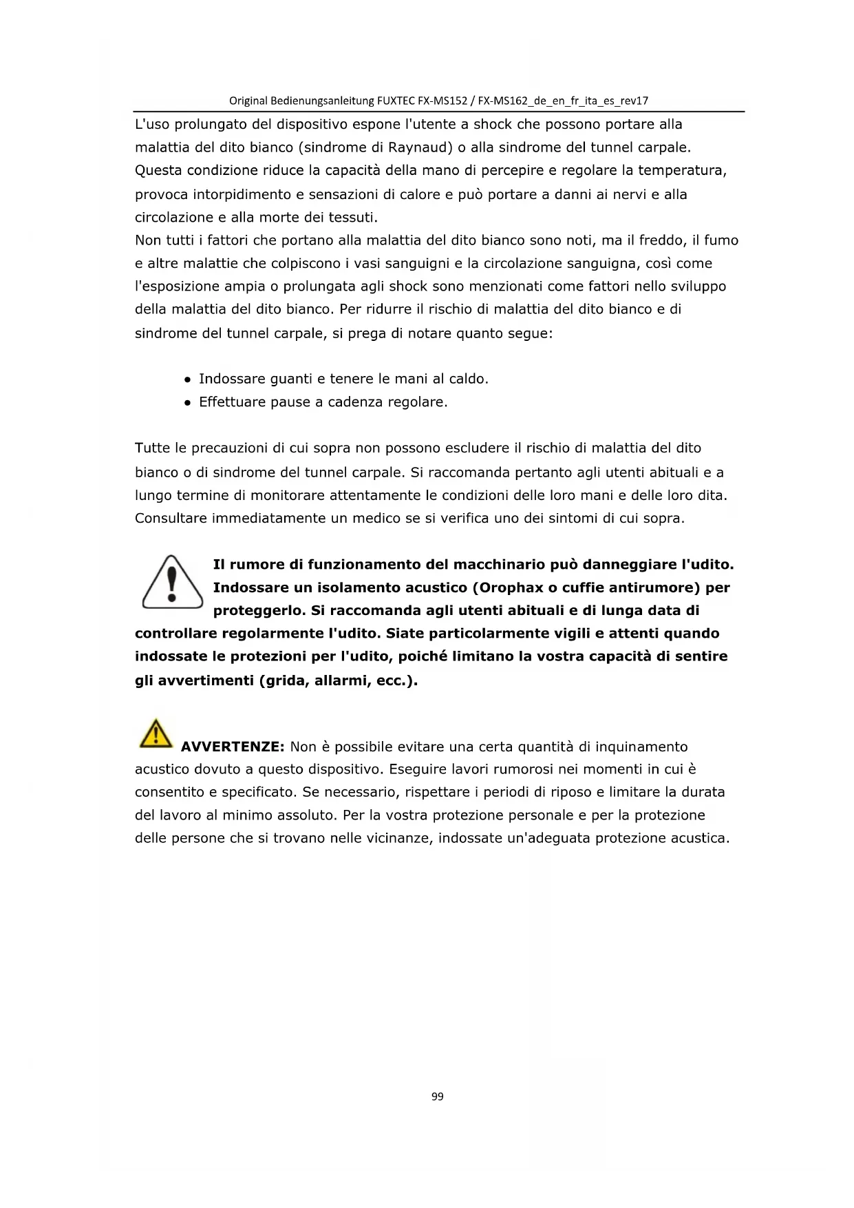 L'uso prolungato del dispositivo espone l'utente a shock che possono portare alla malattia del dito bianco (sindrome di Raynaud) o alla sindrome del tunnel carpale. Questa condizione riduce la capacità della mano di percepire e regolare la temperatura, provoca intorpidimento e sensazioni di calore e può portare a danni ai nervi e alla circolazione e alla morte dei tessuti. Non tutti i fattori che portano alla malattia del dito bianco sono noti, ma il freddo, il fumo e altre malattie che colpiscono i vasi sanguigni e la circolazione sanguigna, così come l'esposizione ampia o prolungata agli shock sono menzionati come fattori nello sviluppo della malattia del dito bianco. Per ridurre il rischio di malattia del dito bianco e di sindrome del tunnel carpale, si prega di notare quanto segue: ● Indossare guanti e tenere le mani al caldo. ● Effettuare pause a cadenza regolare. Tutte le precauzioni di cui sopra non possono escludere il rischio di malattia del dito bianco o di sindrome del tunnel carpale. Si raccomanda pertanto agli utenti abituali e a lungo termine di monitorare attentamente le condizioni delle loro mani e delle loro dita. Consultare immediatamente un medico se si verifica uno dei sintomi di cui sopra. Il rumore di funzionamento del macchinario può danneggiare l'udito. Indossare un isolamento acustico (Orophax o cuffie antirumore) per proteggerlo. Si raccomanda agli utenti abituali e di lunga data di controllare regolarmente l'udito. Siate particolarmente vigili e attenti quando indossate le protezioni per l'udito, poiché limitano la vostra capacità di sentire gli avvertimenti (grida, allarmi, ecc.). AVVERTENZE: Non è possibile evitare una certa quantità di inquinamento acustico dovuto a questo dispositivo. Eseguire lavori rumorosi nei momenti in cui è consentito e specificato. Se necessario, rispettare i periodi di riposo e limitare la durata del lavoro al minimo assoluto. Per la vostra protezione personale e per la protezione delle persone che si trovano nelle vicinanze, indossate un'adeguata protezione acustica.Original Bedienungsanleitung FUXTEC FX-MS152 / FX-MS162_de_en_fr_ita_es_rev17
