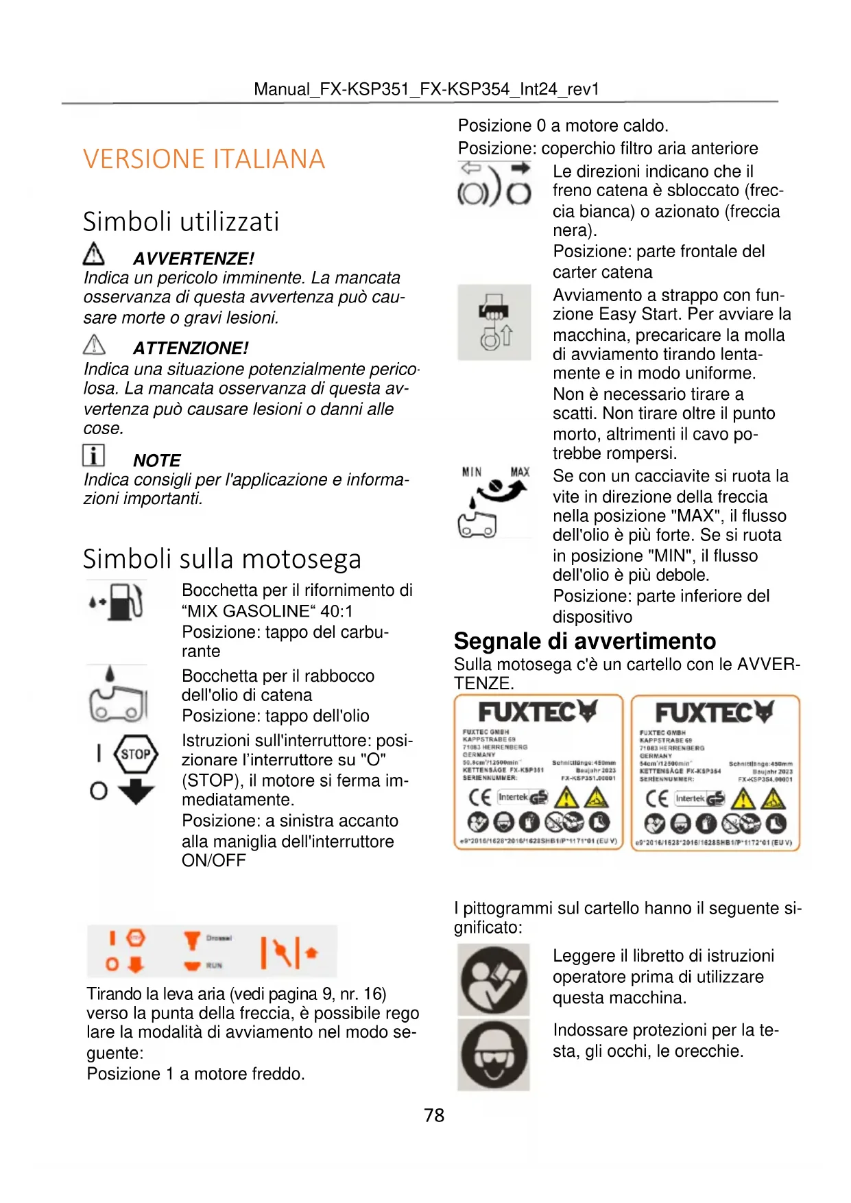 ◼ Bloccare il freno catena attraverso il para- mano anteriore. Per fare ciò, premere in avanti il paramano fino a quando non si sente un suono (1.). ◼ Portare l'interruttore di arresto in posizione "I" (2.). ◼ Rimuovere la copertura di protezione. ◼ Ruotare la manopola choke (3.) fino all'ar- resto. ◼ Posizionare la motosega su una superficie piana e fissarla. Inserire il piede destro nell’incavo dell’impugnatura. ◼ Fissare la motosega con la mano sinistra sull'impugnatura anteriore. ◼ Tirare la maniglia di avviamento della mo- tosega dal cavo fino a quando non si av- verte una resistenza. Quindi tirare la mani- glia (4.) da 2 a 3 volte di continuo fino a quando il motore non inizia a funzionare. ◼ Importante: riportare manualmente lo starter (14) nella sua posizione origi- nale. ◼ Tirare la maniglia di avviamento (11) fino all'avviamento del motore. ◼ Il motore si avvia: - La motosega ha la velocità di rota- zione al minimo ◼ Il motore non si avvia: - Ripetere la procedura di avviamento fino all'avvio del motore. ◼ Sollevare la motosega lentamente e in modo sicuro da terra. Non toccare il gril- letto acceleratore! ◼ Con la mano sinistra tirare la protezione anteriore (leva del freno a catena) verso l'impugnatura anteriore - il freno a catena viene rilasciato.Manual_FX-KSP351_FX-KSP354_Int24_rev1
