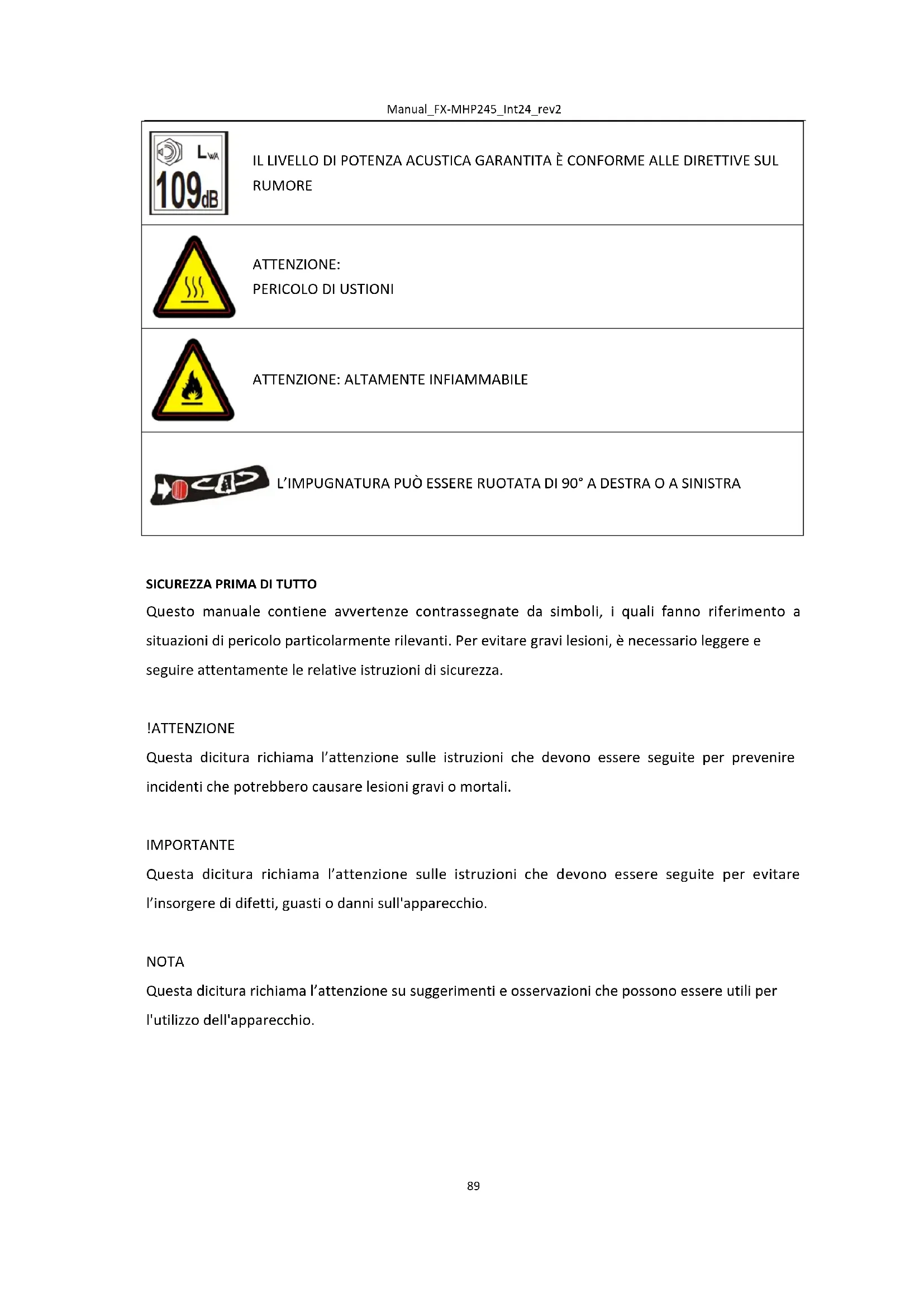 Questo manuale contiene avvertenze contrassegnate da simboli, i quali fanno riferimento a situazioni di pericolo particolarmente rilevanti. Per evitare gravi lesioni, è necessario leggere e seguire attentamente le relative istruzioni di sicurezza. !ATTENZIONE Questa dicitura richiama l’attenzione sulle istruzioni che devono essere seguite per prevenire incidenti che potrebbero causare lesioni gravi o mortali. IMPORTANTE Questa dicitura richiama l’attenzione sulle istruzioni che devono essere seguite per evitare l’insorgere di difetti, guasti o danni sull'apparecchio. NOTA Questa dicitura richiama l’attenzione su suggerimenti e osservazioni che possono essere utili per l'utilizzo dell'apparecchio.Manual_FX-MHP245_Int24_rev2