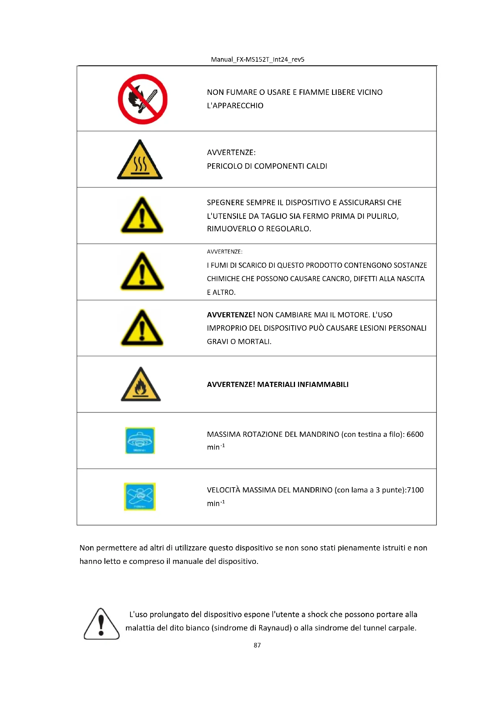 Questa condizione riduce la capacità della mano di percepire e regolare la temperatura, provoca intorpidimento e sensazioni di calore e può portare a danni ai nervi e alla circolazione e alla morte dei tessuti. Non tutti i fattori che portano alla malattia del dito bianco sono noti, ma il freddo, il fumo e altre malattie che colpiscono i vasi sanguigni e la circolazione sanguigna, così come l'esposizione ampia o prolungata agli shock sono menzionati come fattori nello sviluppo della malattia del dito bianco. Per ridurre il rischio di malattia del dito bianco e di sindrome del tunnel carpale, si prega di notare quanto segue: ● Indossare guanti e tenere le mani al caldo. ● Effettuare pause a cadenza regolare. Tutte le precauzioni di cui sopra non possono escludere il rischio di malattia del dito bianco o di sindrome del tunnel carpale. Si raccomanda pertanto agli utenti abituali e a lungo termine di monitorare attentamente le condizioni delle loro mani e delle loro dita. Consultare immediatamente un medico se si verifica uno dei sintomi di cui sopra. Il rumore di funzionamento del macchinario può danneggiare l'udito. Indossare un isolamento acustico (Orophax o cuffie antirumore) per proteggerlo. Si raccomanda agli utenti abituali e di lunga data di controllare regolarmente l'udito. Siate particolarmente vigili e attenti quando indossate le protezioni per l'udito, poiché limitano la vostra capacità di sentire gli avvertimenti (grida, allarmi, ecc.). AVVERTENZE: Non è possibile evitare una certa quantità di inquinamento acustico dovuto a questo dispositivo. Eseguire lavori rumorosi nei momenti in cui è consentito e specificato. Se necessario, rispettare i periodi di riposo e limitare la durata del lavoro al minimo assoluto. Per la vostra protezione personale e per la protezione delle persone che si trovano nelle vicinanze, indossate un'adeguata protezione acustica.Manual_FX-MS152T_Int24_rev5