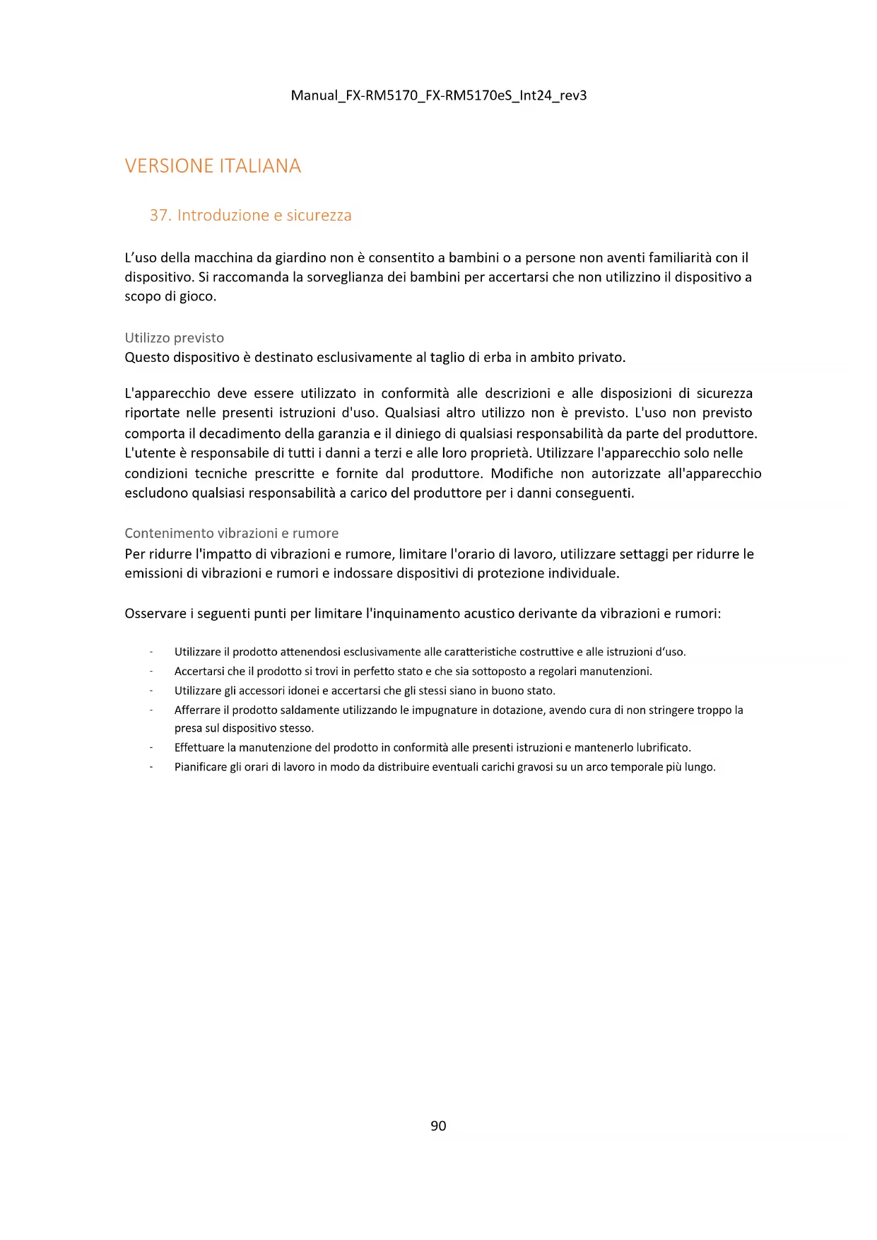 Mantenere il dispositivo fuori dalla portata dei bambini. Assicurarsi che le prese d'aria dell'unità siano pulite. Mantenere tutti i dadi, i bulloni e le viti serrati per garantire che il tagliaerba operi in condizioni di sicurezza. Controllare frequentemente che il cesto raccoglierba non sia usurato o danneggiato. Utilizzare esclusivamente una lama di taglio progettata per questo tagliaerba. Attenersi alle istruzioni per l'installazione e rimuovere preventivamente la batteria (solo per il modello eS). Le riparazioni devono essere eseguite esclusivamente da un tecnico qualificato o da un centro di assistenza.Manual_FX-RM5170_FX-RM5170eS_Int24_rev3