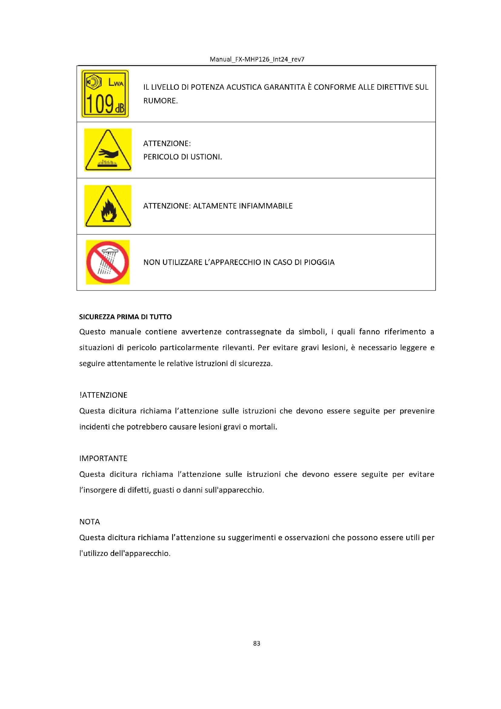 Questo manuale contiene avvertenze contrassegnate da simboli, i quali fanno riferimento a situazioni di pericolo particolarmente rilevanti. Per evitare gravi lesioni, è necessario leggere e seguire attentamente le relative istruzioni di sicurezza. !ATTENZIONE Questa dicitura richiama l’attenzione sulle istruzioni che devono essere seguite per prevenire incidenti che potrebbero causare lesioni gravi o mortali. IMPORTANTE Questa dicitura richiama l’attenzione sulle istruzioni che devono essere seguite per evitare l’insorgere di difetti, guasti o danni sull'apparecchio. NOTA Questa dicitura richiama l’attenzione su suggerimenti e osservazioni che possono essere utili per l'utilizzo dell'apparecchio.Manual_FX-MHP126_Int24_rev7