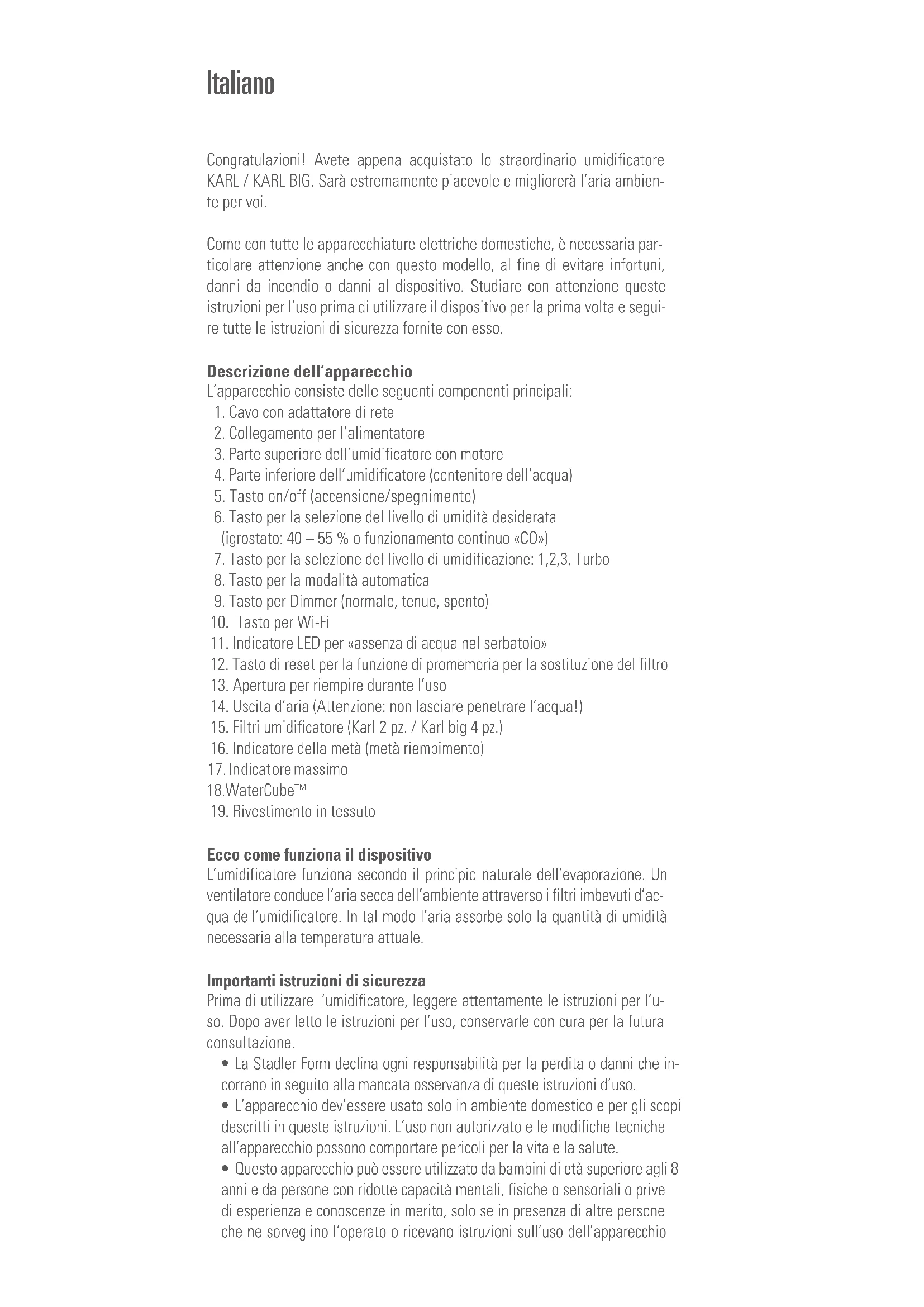 Dimensions 502 x 335 x 242 mm (largeur x hauteur x profondeur) Poids 4,6 kg Contenance du reservoir 11,0 Litres Niveau de bruit 27 – 60 dB(A) Conforme à la réglementation UE CE / DEEE / RoHS / EAC / UKCA Cet appareil contient un module radio de Stadler Form SA de type WBR3. Il fonctionne dans la bande ISM, gamme de fréquence 2.400 – 2.4835 Ghz, avec une puissance d’émission de 20 dBm. Sous réserve de modifications techniquesCongratulazioni! Avete appena acquistato lo straordinario umidificatore KARL / KARL BIG. Sarà estremamente piacevole e migliorerà l’aria ambien- te per voi. Come con tutte le apparecchiature elettriche domestiche, è necessaria par- ticolare attenzione anche con questo modello, al fine di evitare infortuni, danni da incendio o danni al dispositivo. Studiare con attenzione queste istruzioni per l’uso prima di utilizzare il dispositivo per la prima volta e segui- re tutte le istruzioni di sicurezza fornite con esso. Descrizione dell’apparecchio L’apparecchio consiste delle seguenti componenti principali: