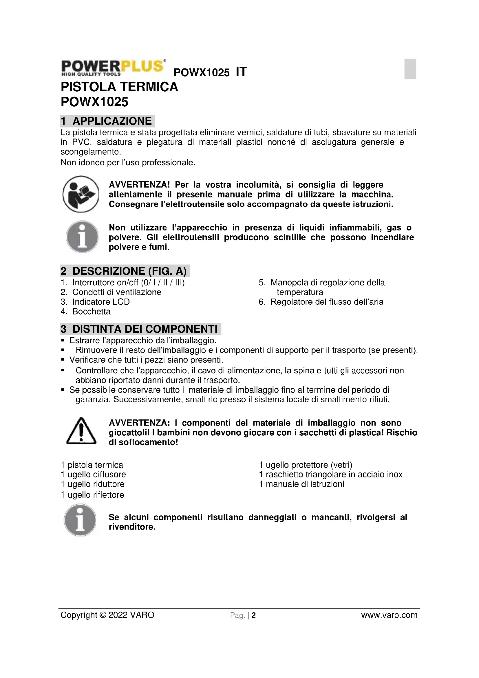 Copyright © 2022 VARO Pag. | 2 www.varo.com PISTOLA TERMICA POWX1025 1 APPLICAZIONE La pistola termica e stata progettata eliminare vernici, saldature di tubi, sbavature su materiali in PVC, saldatura e piegatura di materiali plastici nonché di asciugatura generale e scongelamento. Non idoneo per l’uso professionale. AVVERTENZA! Per la vostra incolumità, si consiglia di leggere attentamente il presente manuale prima di utilizzare la macchina. Consegnare l’elettroutensile solo accompagnato da queste istruzioni. Non utilizzare l’apparecchio in presenza di liquidi infiammabili, gas o polvere. Gli elettroutensili producono scintille che possono incendiare polvere e fumi. 2 DESCRIZIONE (FIG. A)