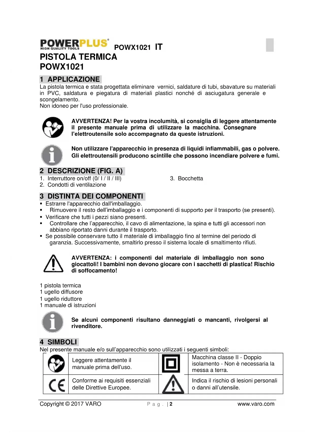 Copyright © 2017 VARO P a g . | 2 www.varo.com PISTOLA TERMICA POWX1021 1 APPLICAZIONE La pistola termica e stata progettata eliminare vernici, saldature di tubi, sbavature su materiali in PVC, saldatura e piegatura di materiali plastici nonché di asciugatura generale e scongelamento. Non idoneo per l'uso professionale. AVVERTENZA! Per la vostra incolumità, si consiglia di leggere attentamente il presente manuale prima di utilizzare la macchina. Consegnare l’elettroutensile solo accompagnato da queste istruzioni. Non utilizzare l'apparecchio in presenza di liquidi infiammabili, gas o polvere. Gli elettroutensili producono scintille che possono incendiare polvere e fumi. 2 DESCRIZIONE (FIG. A)