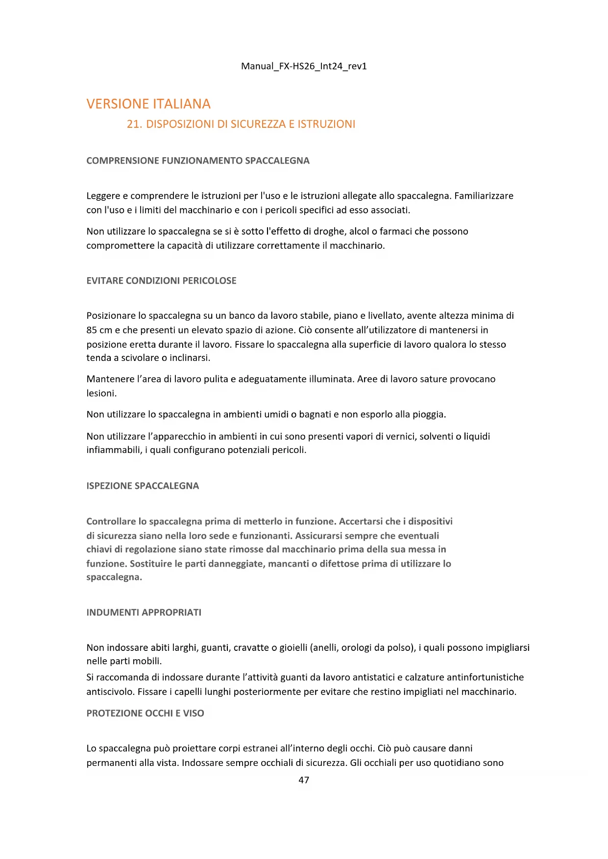 Verificare che il circuito elettrico sia adeguatamente protetto e che sia adeguato alla potenza, alla tensione e alla frequenza del motore. Controllare preventivamente la presenza del collegamento a terra e di un interruttore differenziale. Collegare a terra lo spaccalegna. Evitare il contatto del corpo con strutture collegate a terra: tubi, termosifoni, stufe e frigoriferi. Non aprire mai la scatola dei comandi del motore. Se ciò si rivelasse necessario, consultare un elettricista qualificato. Fare attenzione a non toccare con le dita i poli metallici della spina durante il collegamento o lo scollegamento dello spaccalegna dalla presa elettrica. MANTENIMENTO A DISTANZA DI ASTANTI E BAMBINI Lo spaccalegna può essere utilizzato esclusivamente da una persona alla volta. Gli estranei devono mantenersi a distanza di sicurezza dall’area di lavoro, in particolar modo durante il funzionamento dello spaccalegna. Non servirsi in alcun modo di un’altra persona per effettuare lo sblocco di un ceppo di legno incagliato. VERIFICA CEPPO Assicurarsi che non vi siano chiodi o corpi estranei nei tronchi da tagliare. Le estremità dei tronchi devono essere tagliate perpendicolarmente. I rami devono essere tagliati allo stesso livello del tronco. ULTERIORI RACCOMANDAZIONI Non operare su terreni scivolosi.Manual_FX-HS26_Int24_rev1