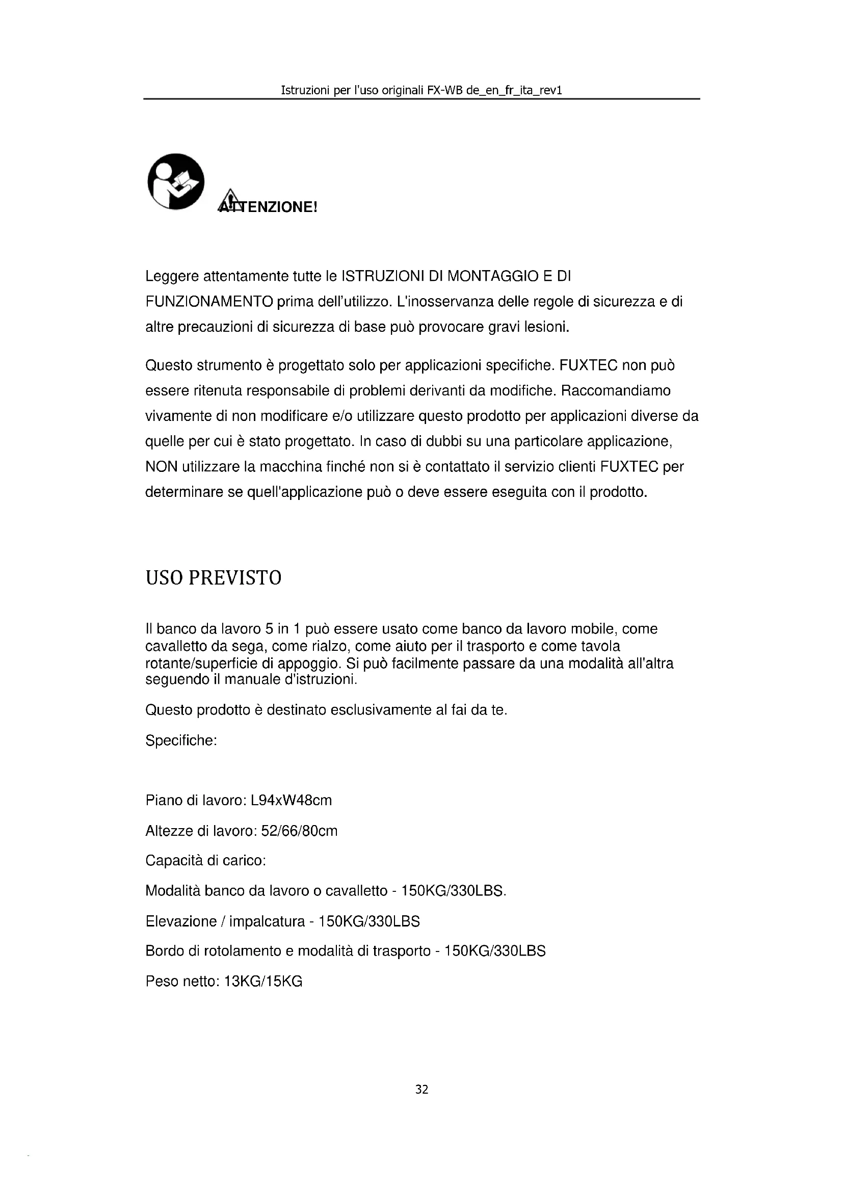 ATTENZIONE! Leggere attentamente tutte le ISTRUZIONI DI MONTAGGIO E DI FUNZIONAMENTO prima dell’utilizzo. L'inosservanza delle regole di sicurezza e di altre precauzioni di sicurezza di base può provocare gravi lesioni. Questo strumento è progettato solo per applicazioni specifiche. FUXTEC non può essere ritenuta responsabile di problemi derivanti da modifiche. Raccomandiamo vivamente di non modificare e/o utilizzare questo prodotto per applicazioni diverse da quelle per cui è stato progettato. In caso di dubbi su una particolare applicazione, NON utilizzare la macchina finché non si è contattato il servizio clienti FUXTEC per determinare se quell'applicazione può o deve essere eseguita con il prodotto. USO PREVISTO Il banco da lavoro 5 in 1 può essere usato come banco da lavoro mobile, come cavalletto da sega, come rialzo, come aiuto per il trasporto e come tavola rotante/superficie di appoggio. Si può facilmente passare da una modalità all'altra seguendo il manuale d'istruzioni. Questo prodotto è destinato esclusivamente al fai da te. Specifiche: Piano di lavoro: L94xW48cm Altezze di lavoro: 52/66/80cm Capacità di carico: Modalità banco da lavoro o cavalletto - 150KG/330LBS. Elevazione / impalcatura - 150KG/330LBS Bordo di rotolamento e modalità di trasporto - 150KG/330LBS Peso netto: 13KG/15KGIstruzioni per l'uso originali FX-WB de_en_fr_ita_rev1