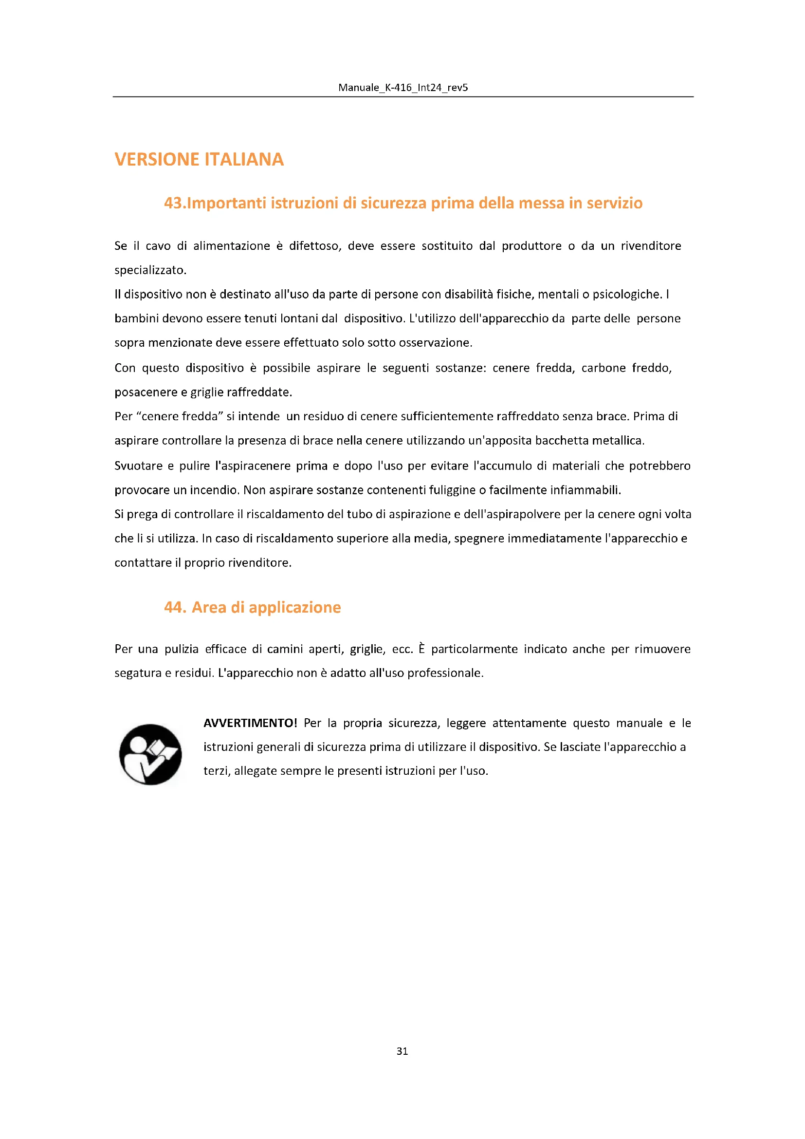 Per una pulizia efficace di camini aperti, griglie, ecc. È particolarmente indicato anche per rimuovere segatura e residui. L'apparecchio non è adatto all'uso professionale. AVVERTIMENTO! Per la propria sicurezza, leggere attentamente questo manuale e le istruzioni generali di sicurezza prima di utilizzare il dispositivo. Se lasciate l'apparecchio a terzi, allegate sempre le presenti istruzioni per l'uso.Manuale_K-416_Int24_rev5