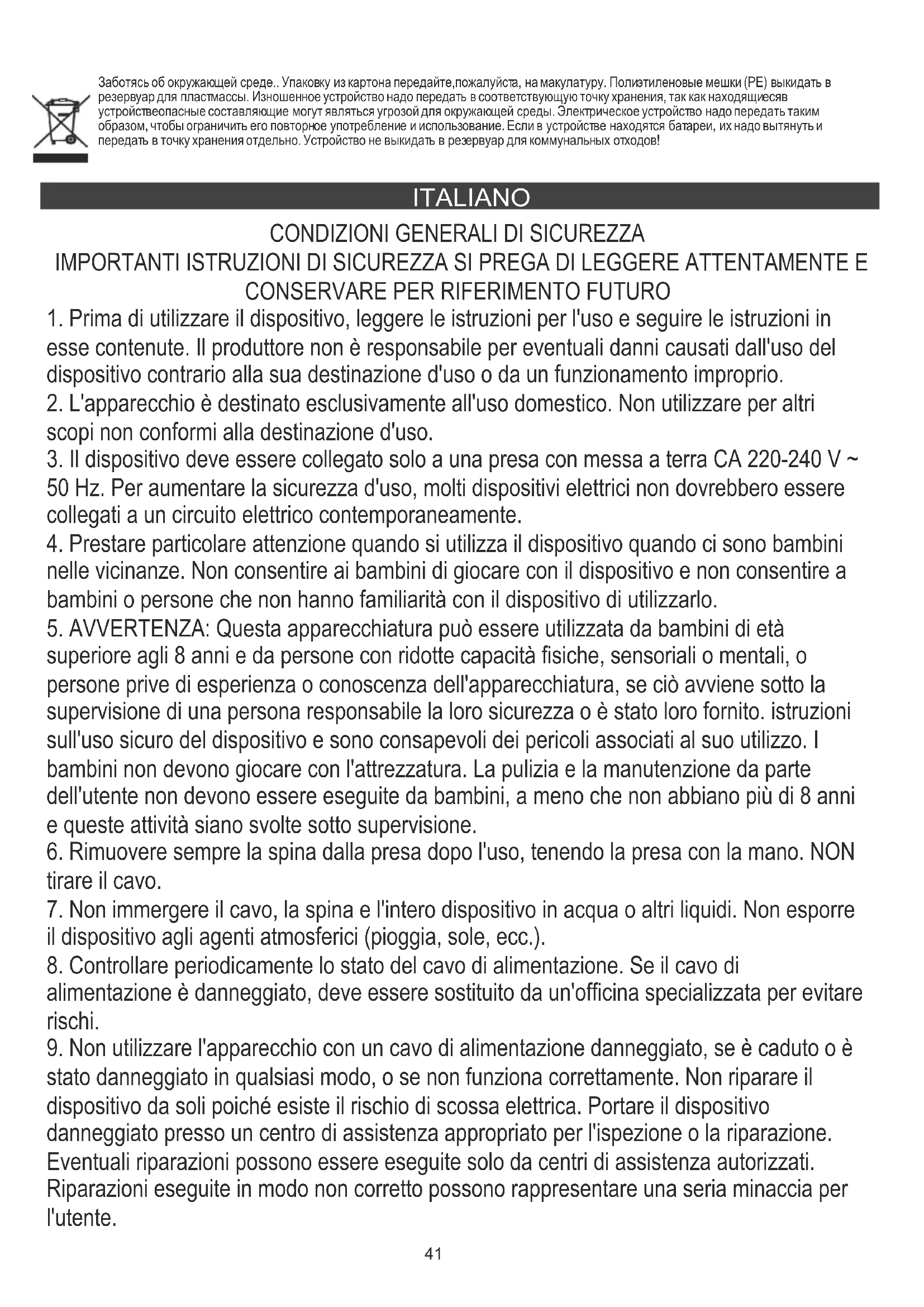 stato danneggiato in qualsiasi modo, o se non funziona correttamente. Non riparare il dispositivo da soli poiché esiste il rischio di scossa elettrica. Portare il dispositivo danneggiato presso un centro di assistenza appropriato per l'ispezione o la riparazione. Eventuali riparazioni possono essere eseguite solo da centri di assistenza autorizzati. Riparazioni eseguite in modo non corretto possono rappresentare una seria minaccia per l'utente. Заботясь об окружающей среде.. Упаковку из картона передайте,пожалуйста, на макулатуру. Полиэтиленовые мешки (РЕ) выкидать в резервуар для пластмассы. Изношенное устройство надо передать в соответствующую точку хранения, так как находящиесяв устройствеопасные составляющие могут являться угрозой для окружающей среды. Электрическое устройство надо передать таким образом, чтобы ограничить его повторное употребление и использование. Если в устройстве находятся батареи, их надо вытянуть и передать в точку хранения отдельно. Устройство не выкидать в резервуар для коммунальных отходов!42
