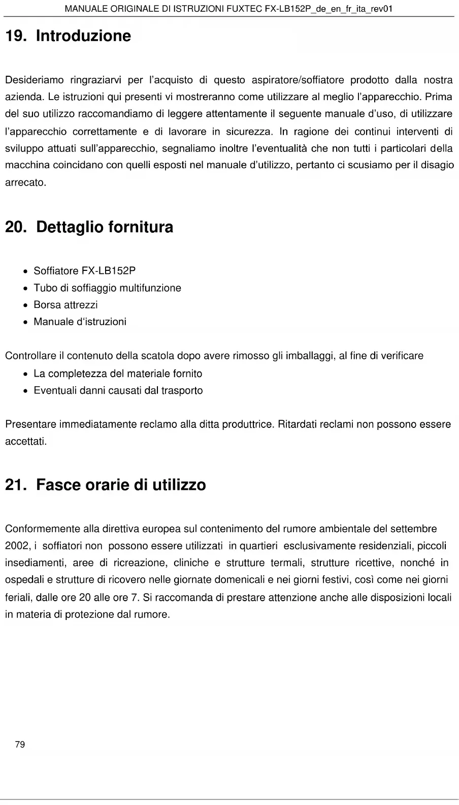 Conformemente alla direttiva europea sul contenimento del rumore ambientale del settembre 2002, i soffiatori non possono essere utilizzati in quartieri esclusivamente residenziali, piccoli insediamenti, aree di ricreazione, cliniche e strutture termali, strutture ricettive, nonché in ospedali e strutture di ricovero nelle giornate domenicali e nei giorni festivi, così come nei giorni feriali, dalle ore 20 alle ore 7. Si raccomanda di prestare attenzione anche alle disposizioni locali in materia di protezione dal rumore.MANUALE ORIGINALE DI ISTRUZIONI FUXTEC FX-LB152P_de_en_fr_ita_rev01