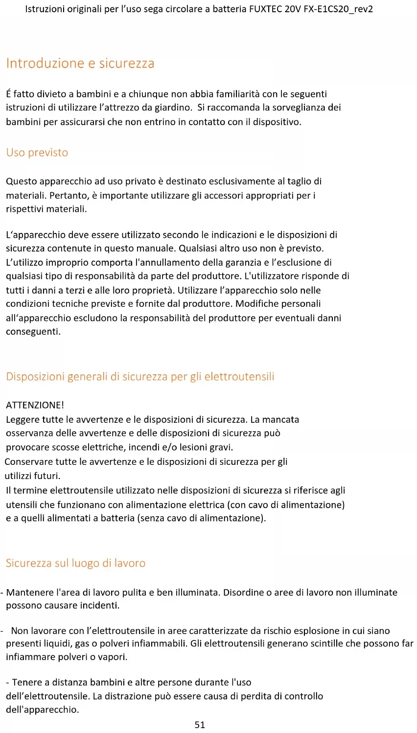 Disposizioni di sicurezza per seghe circolari a batteria Disposizioni generali di sicurezza - Per la propria sicurezza e quella altrui, leggere questo manuale e le relative disposizioni di sicurezza prima di utilizzare il dispositivo. Conservare le istruzioni per l'uso e le relative disposizioni di sicurezza per gli utilizzi futuri, avendole sempre a portata di mano. - In caso di cambio di proprietario, allegare le istruzioni d‘uso al dispositivo. - Le persone che utilizzano il dispositivo non devono essere sotto l'effetto di sostanze stupefacenti (es. alcool, droghe o medicinali). - Utilizzare il dispositivo secondo le condizioni tecniche prescritte e fornite dal produttore. Modifiche personali all‘apparecchio escludono la responsabilità del produttore per eventuali danni conseguenti. - Utilizzare il dispositivo solo in presenza di luce diurna o buona illuminazione artificiale. - Utilizzare l‘apparecchio solo in condizioni di umidità assente. Tenerlo al riparo da pioggia o umidità. Infiltrazioni d‘acqua nell’apparecchio aumentano il rischio di scosse elettriche. - Spegnere il dispositivo e rimuovere la batteria al verificarsi degli eventi di seguito riportati: ⬧ se il dispositivo viene lasciato incustodito; ⬧ prima del controllo, della pulizia o di altri lavori sull’apparecchio; ⬧ se il dispositivo inizia a vibrare eccessivamente.55 Istruzioni originali per l’uso sega circolare a batteria FUXTEC 20V FX-E1CS20_rev2