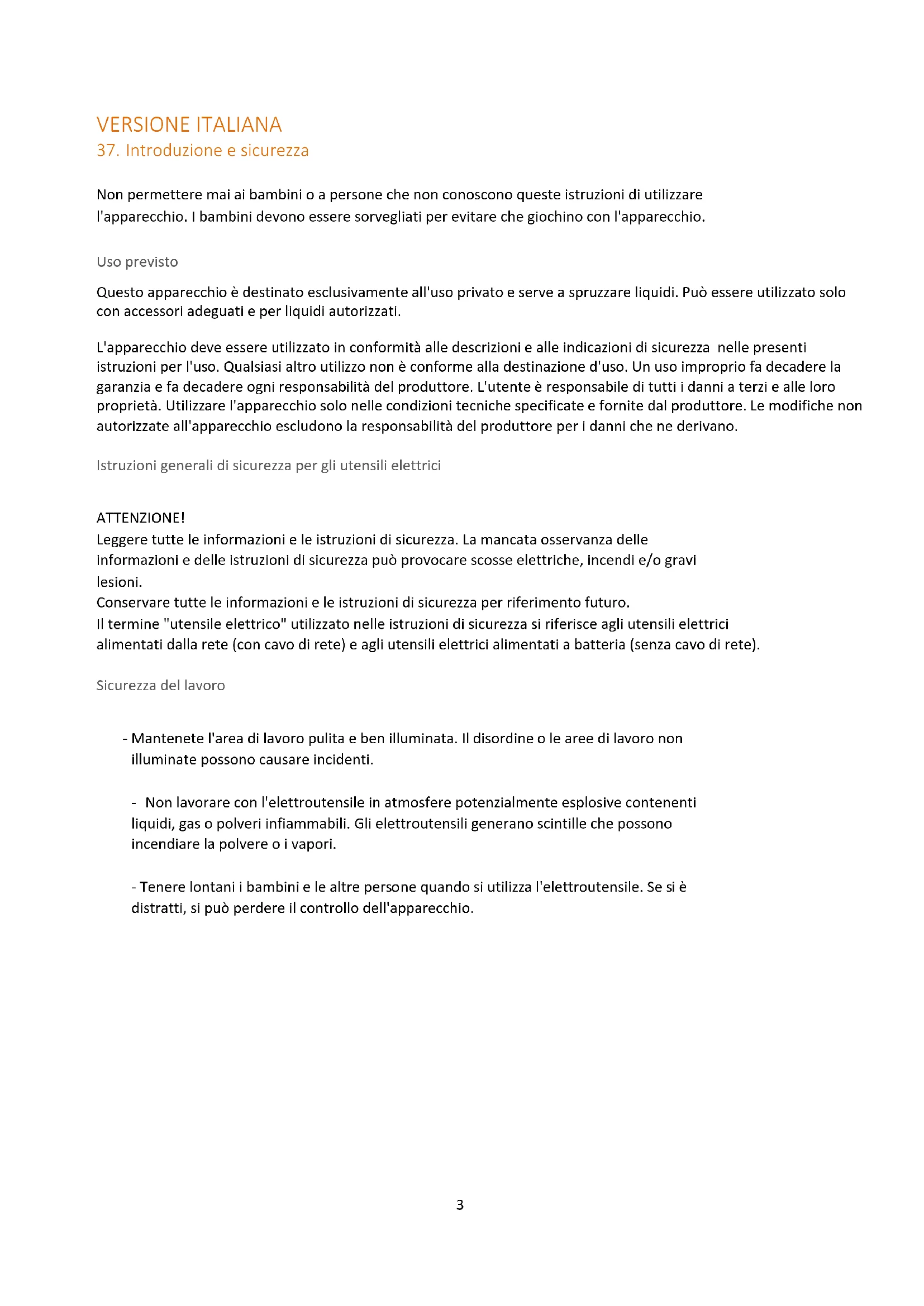 Non permettere mai ai bambini o a persone che non conoscono queste istruzioni di utilizzare l'apparecchio. I bambini devono essere sorvegliati per evitare che giochino con l'apparecchio. Uso previsto Questo apparecchio è destinato esclusivamente all'uso privato e serve a spruzzare liquidi. Può essere utilizzato solo con accessori adeguati e per liquidi autorizzati. L'apparecchio deve essere utilizzato in conformità alle descrizioni e alle indicazioni di sicurezza nelle presenti istruzioni per l'uso. Qualsiasi altro utilizzo non è conforme alla destinazione d'uso. Un uso improprio fa decadere la garanzia e fa decadere ogni responsabilità del produttore. L'utente è responsabile di tutti i danni a terzi e alle loro proprietà. Utilizzare l'apparecchio solo nelle condizioni tecniche specificate e fornite dal produttore. Le modifiche non autorizzate all'apparecchio escludono la responsabilità del produttore per i danni che ne derivano. Istruzioni generali di sicurezza per gli utensili elettrici ATTENZIONE! Leggere tutte le informazioni e le istruzioni di sicurezza. La mancata osservanza delle informazioni e delle istruzioni di sicurezza può provocare scosse elettriche, incendi e/o gravi lesioni. Conservare tutte le informazioni e le istruzioni di sicurezza per riferimento futuro. Il termine "utensile elettrico" utilizzato nelle istruzioni di sicurezza si riferisce agli utensili elettrici alimentati dalla rete (con cavo di rete) e agli utensili elettrici alimentati a batteria (senza cavo di rete). Sicurezza del lavoro - Mantenete l'area di lavoro pulita e ben illuminata. Il disordine o le aree di lavoro non illuminate possono causare incidenti. - Non lavorare con l'elettroutensile in atmosfere potenzialmente esplosive contenenti liquidi, gas o polveri infiammabili. Gli elettroutensili generano scintille che possono incendiare la polvere o i vapori. - Tenere lontani i bambini e le altre persone quando si utilizza l'elettroutensile. Se si è distratti, si può perdere il controllo dell'apparecchio.4