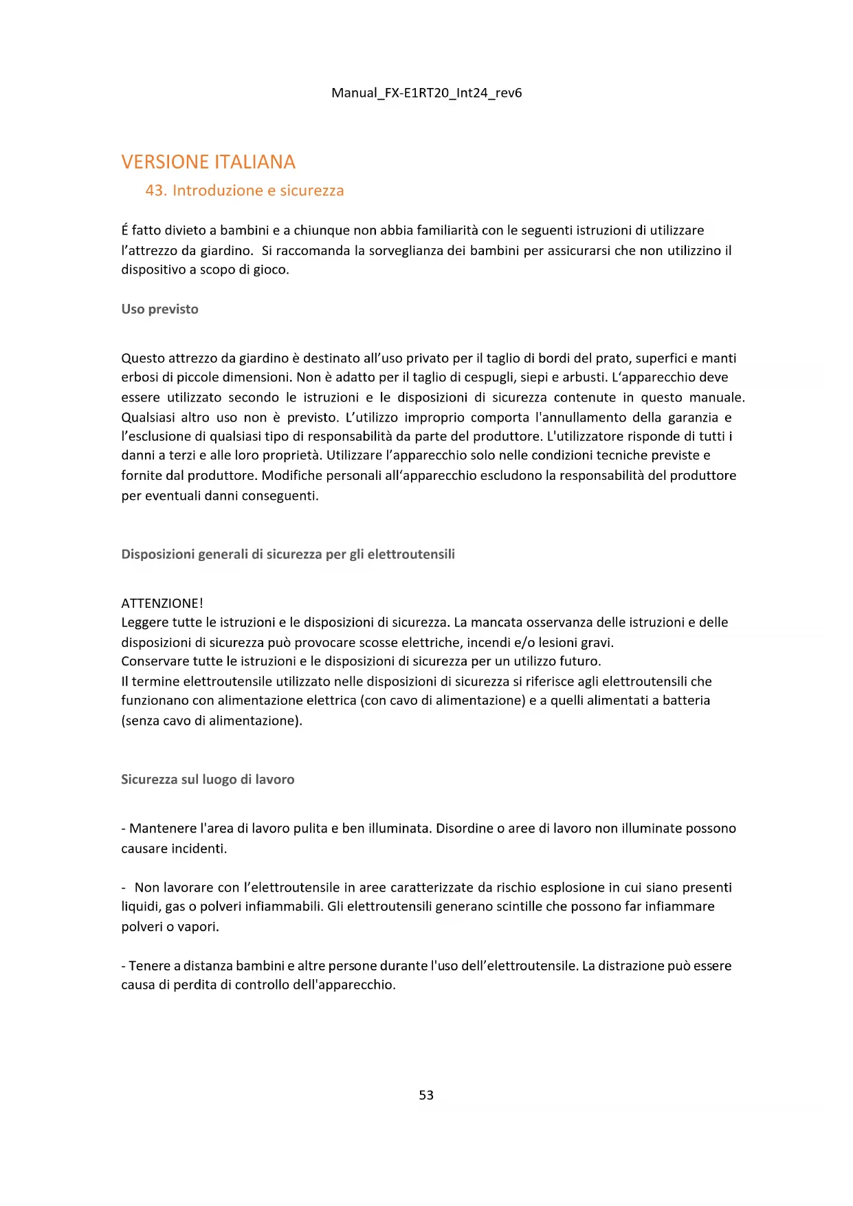 Prima dell‘uso - Familiarizzare con il decespugliatore, con le sue funzioni e i suoi comandi prima di iniziare ad utilizzarlo. - Prima della messa in funzione controllare che l'unità non presenti segni di usura o danni dovuti ad un precedente urto o impatto. - Non utilizzare un dispositivo il cui interruttore sia difettoso e non possa più essere acceso o spento. - Controllare che tutti i dadi, i bulloni e le viti siano ben stretti per garantire un funzionamento sicuro dell'unità. - Non utilizzare mai un apparecchio con parti danneggiate o mancanti. Farle riparare o, se necessario, farle sostituire da un tecnico qualificato o da un'officina specializzata. - Per ridurre il rischio di lesioni gravi, non utilizzare mai fili metallici aventi funzione di filo da taglio. - Quando si lavora con o sull'apparecchio, indossare sempre scarpe robuste, pantaloni lunghi e i dispositivi di protezione individuale adeguati (occhiali di sicurezza, protezioni acustiche, guanti da lavoro antiscivolo, ecc.). L'uso di dispositivi di protezione individuale riduce il rischio di lesioni. - Non indossare gioielli o indumenti larghi che potrebbero rimanere impigliati nel decespugliatore. Tenere i capelli lunghi lontano dal dispositivo di taglio. - Controllare l’area in cui viene utilizzato l’apparecchio e rimuovere pietre e fili che potrebbero impigliarsi nel decespugliatore, al fine di garantire l’incolumità delle persone. - Rimuovere strumenti di regolazione o chiavi prima di accendere il decespugliatore. Attrezzi o chiavi inglesi che si trovano in una parte mobile della macchina possono causare lesioni. Durante l‘utilizzo - Non azionare il dispositivo se nelle immediate vicinanze si trovano persone (soprattutto bambini) o animali. - Interrompere il lavoro se si rileva la presenza di persone (soprattutto bambini) o animali domestici nelle vicinanze. - Tenere sempre mani e piedi lontano dalle lame in movimento, soprattutto quando si accende il decespugliatore.Manual_FX-E1RT20_Int24_rev6