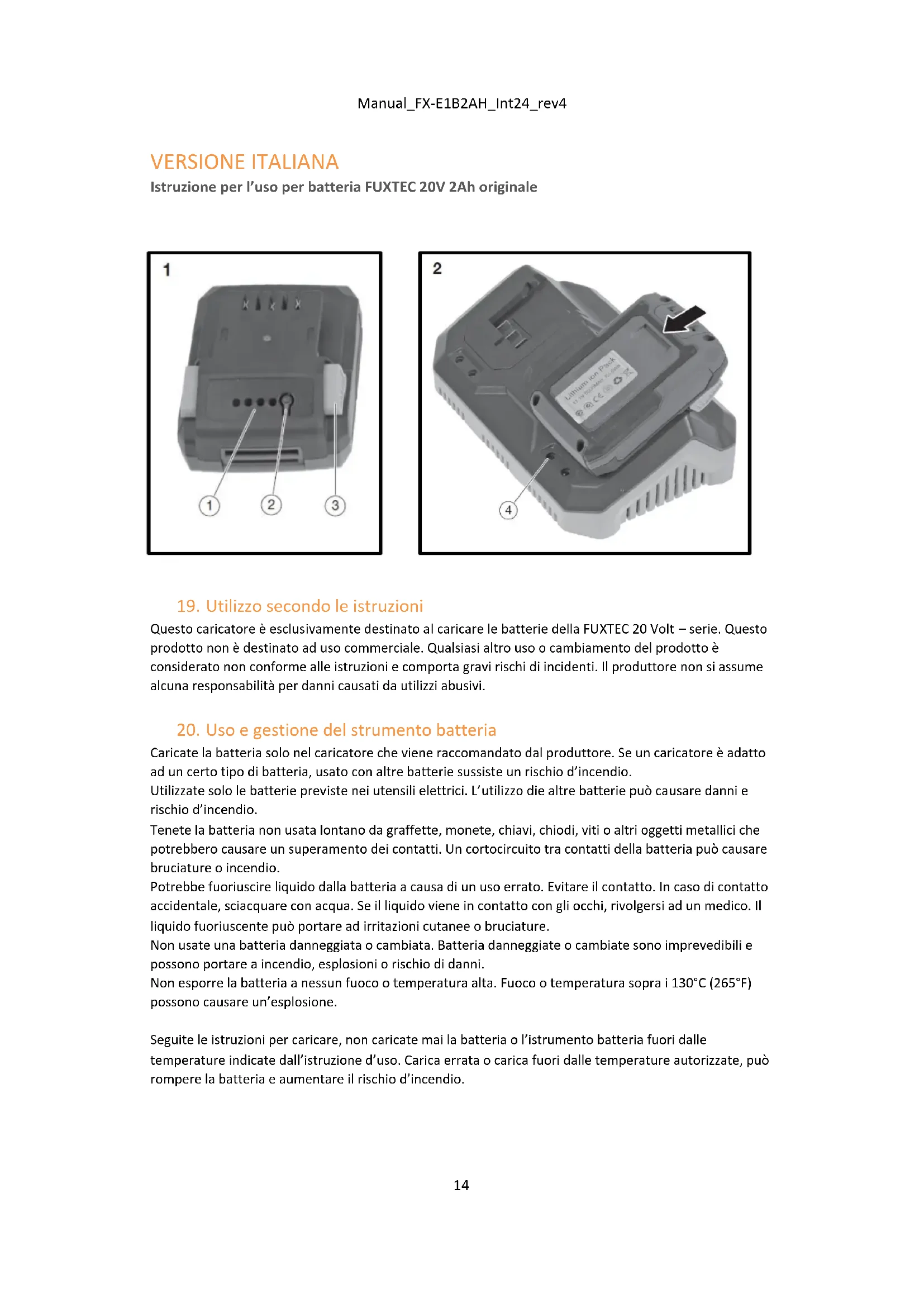 VERSIONE ITALIANA Istruzione per l’uso per batteria FUXTEC 20V 2Ah originale