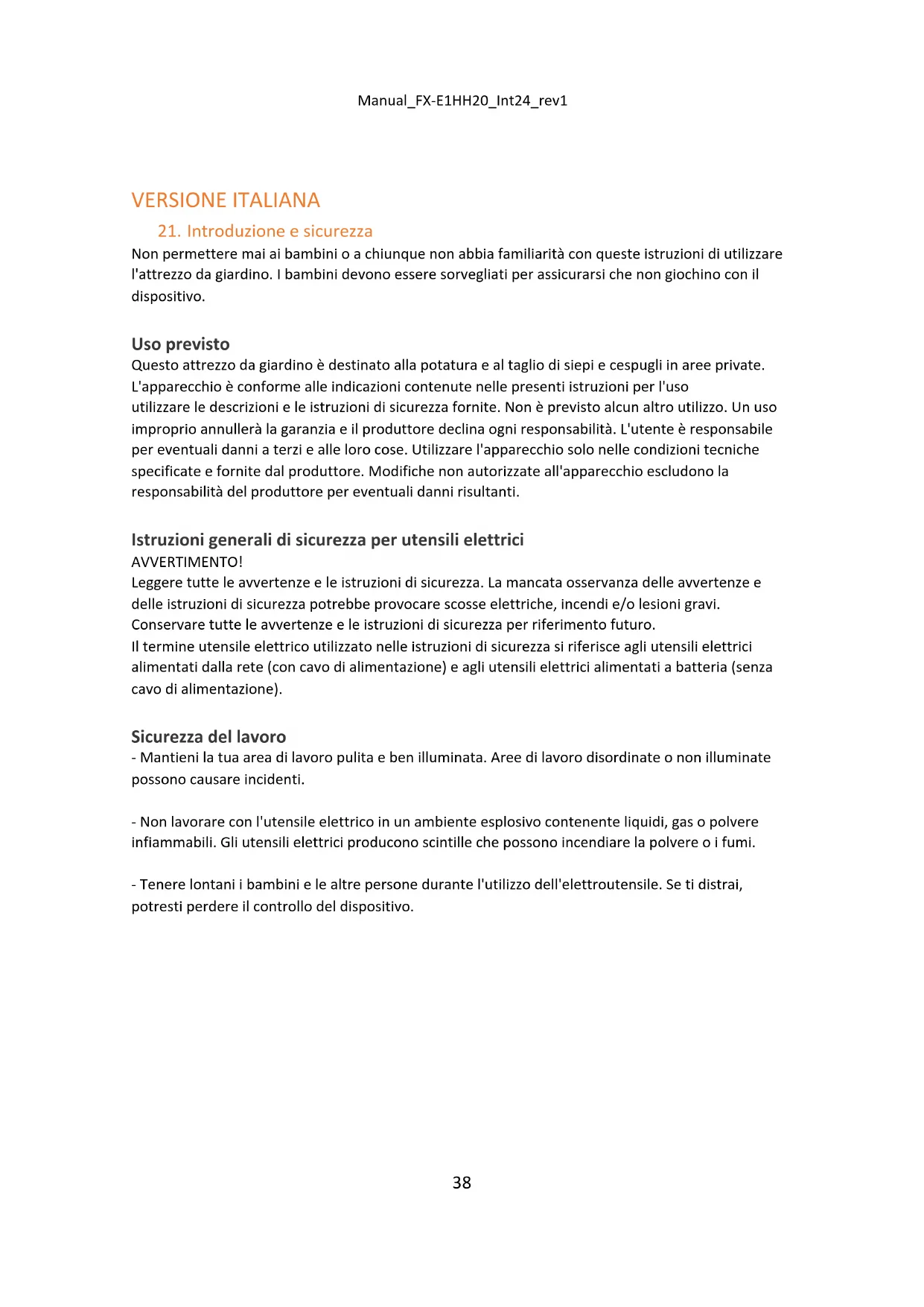 - Per la vostra sicurezza e quella degli altri, leggere questo manuale di istruzioni e le relative istruzioni di sicurezza prima di utilizzare il dispositivo. Si prega di conservare le istruzioni per l'uso e conservare le istruzioni di sicurezza al sicuro per un uso successivo ogni uso a portata di mano. - In caso di cambio di proprietario consegnare le istruzioni per l'uso insieme all'apparecchio. - Le persone che utilizzano l'apparecchio non devono trovarsi sotto l'effetto di sostanze intossicanti (ad es. alcol, droghe o farmaci). - Utilizzare l'apparecchio solo nel modo prescritto e fornito dal produttore condizione tecnica. Modifiche non autorizzate all'apparecchio escludono la responsabilità del produttore per eventuali danni conseguenti. - Utilizzare il dispositivo solo alla luce del giorno o con una buona illuminazione artificiale. - Utilizzare il dispositivo solo in condizioni climatiche asciutte. Tenerlo lontano dalla pioggia o dal bagnato. Se si consente all'acqua di entrare nel dispositivo, si aumenta il rischio di scosse elettriche. - Spegnere il dispositivo e rimuovere la batteria nelle seguenti condizioni : ⬧ se il dispositivo viene lasciato incustodito; ⬧prima di controllare, pulire o eseguire qualsiasi altro intervento sull'apparecchio; ⬧se il dispositivo inizia a vibrare eccessivamente. Prima dell'uso - Prima di iniziare il lavoro, familiarizzare con il tagliasiepi e con le sue funzioni e comandi. - Controllare il dispositivo per eventuali segni di usura o danni prima dell'uso e dopo un impatto. - Non utilizzare un dispositivo il cui interruttore è difettoso e non può più essere acceso o spento. - Controllare che tutti i dadi, i bulloni e le viti siano serrati per garantire il funzionamento sicuro del dispositivo. - Non utilizzare mai un apparecchio con parti danneggiate o mancanti. Farli riparare o, se necessario, sostituire da uno specialista qualificato o da un'officina specializzata.Manual_FX-E1HH20_Int24_rev1