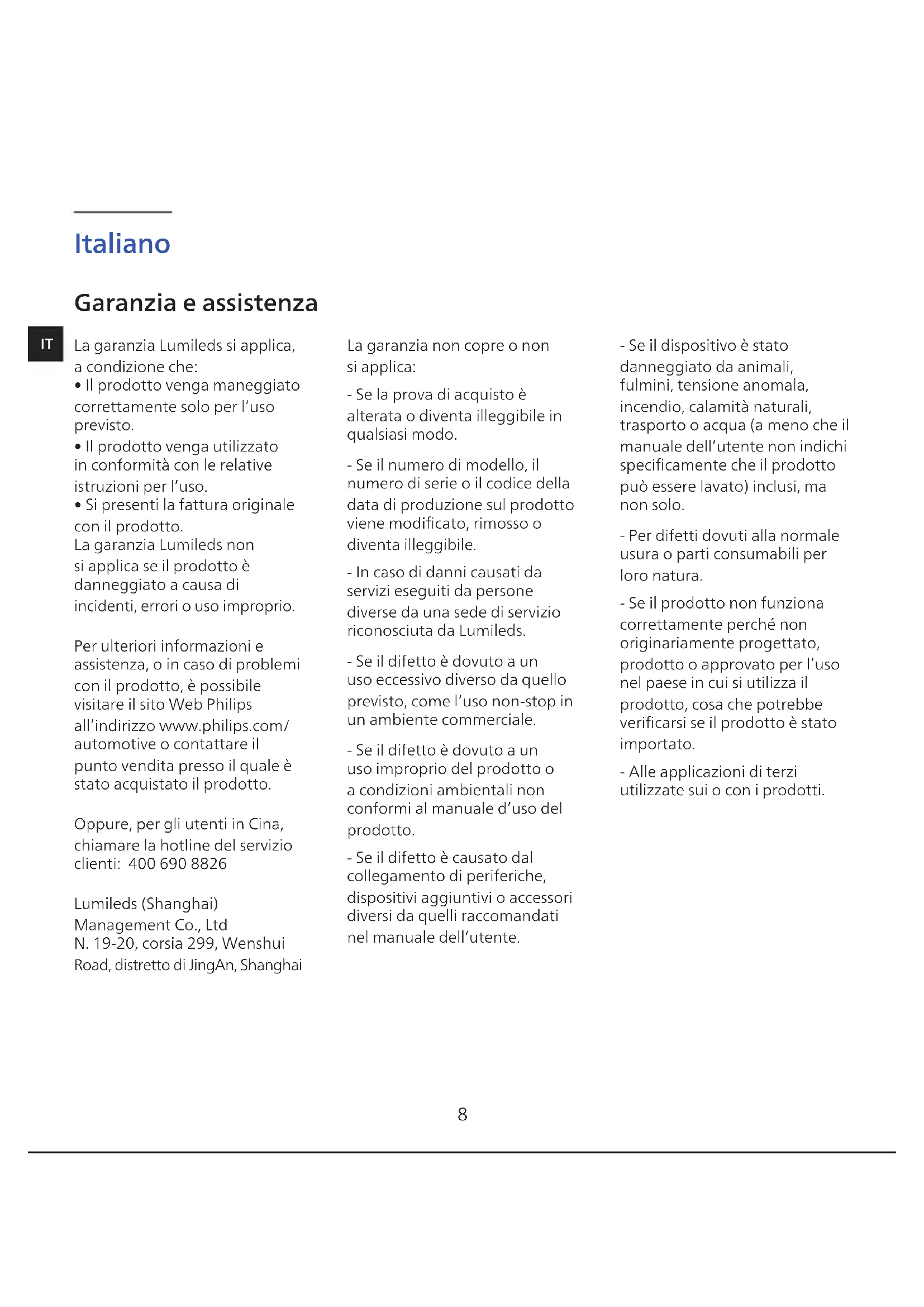 - Si presenti la fattura originale con il prodotto. La garanzia Lumileds non si applica se il prodotto è danneggiato a causa di incidenti, errori o uso improprio. Per ulteriori informazioni e assistenza, o in caso di problemi con il prodotto, è possibile visitare il sito Web Philips all’indirizzo www.philips.com/ automotive o contattare il punto vendita presso il quale è stato acquistato il prodotto. Oppure, per gli utenti in Cina, chiamare la hotline del servizio clienti: 400 690 8826 Lumileds (Shanghai) Management Co., Ltd N. 19-20, corsia 299, Wenshui Road, distretto di JingAn, Shanghai La garanzia non copre o non si applica: - Se la prova di acquisto è alterata o diventa illeggibile in qualsiasi modo. - Se il numero di modello, il numero di serie o il codice della data di produzione sul prodotto vienemodicato,rimossoo diventa illeggibile. - In caso di danni causati da servizi eseguiti da persone diverse da una sede di servizio riconosciuta da Lumileds. - Se il difetto è dovuto a un uso eccessivo diverso da quello previsto, come l’uso non-stop in un ambiente commerciale. - Se il difetto è dovuto a un uso improprio del prodotto o a condizioni ambientali non conformi al manuale d’uso del prodotto. - Se il difetto è causato dal collegamento di periferiche, dispositivi aggiuntivi o accessori diversi da quelli raccomandati nel manuale dell’utente. - Se il dispositivo è stato danneggiato da animali, fulmini, tensione anomala, incendio, calamità naturali, trasporto o acqua (a meno che il manuale dell’utente non indichi specicamentecheilprodotto può essere lavato) inclusi, ma non solo. - Per difetti dovuti alla normale usura o parti consumabili per loro natura. - Se il prodotto non funziona correttamente perché non originariamente progettato, prodotto o approvato per l’uso nel paese in cui si utilizza il prodotto, cosa che potrebbe vericarsiseilprodottoèstato importato. - Alle applicazioni di terzi utilizzate sui o con i prodotti. Garanzia e assistenza IT9 1 m Informazioni importanti Non pulire o versare liquidi come acqua, detergenti o solventiinammabilisul dispositivo. Mantenereildiusorediaromi per auto libero da qualsiasi ostruzione. Non coprire! Perpulireildiusorediaromi per auto: