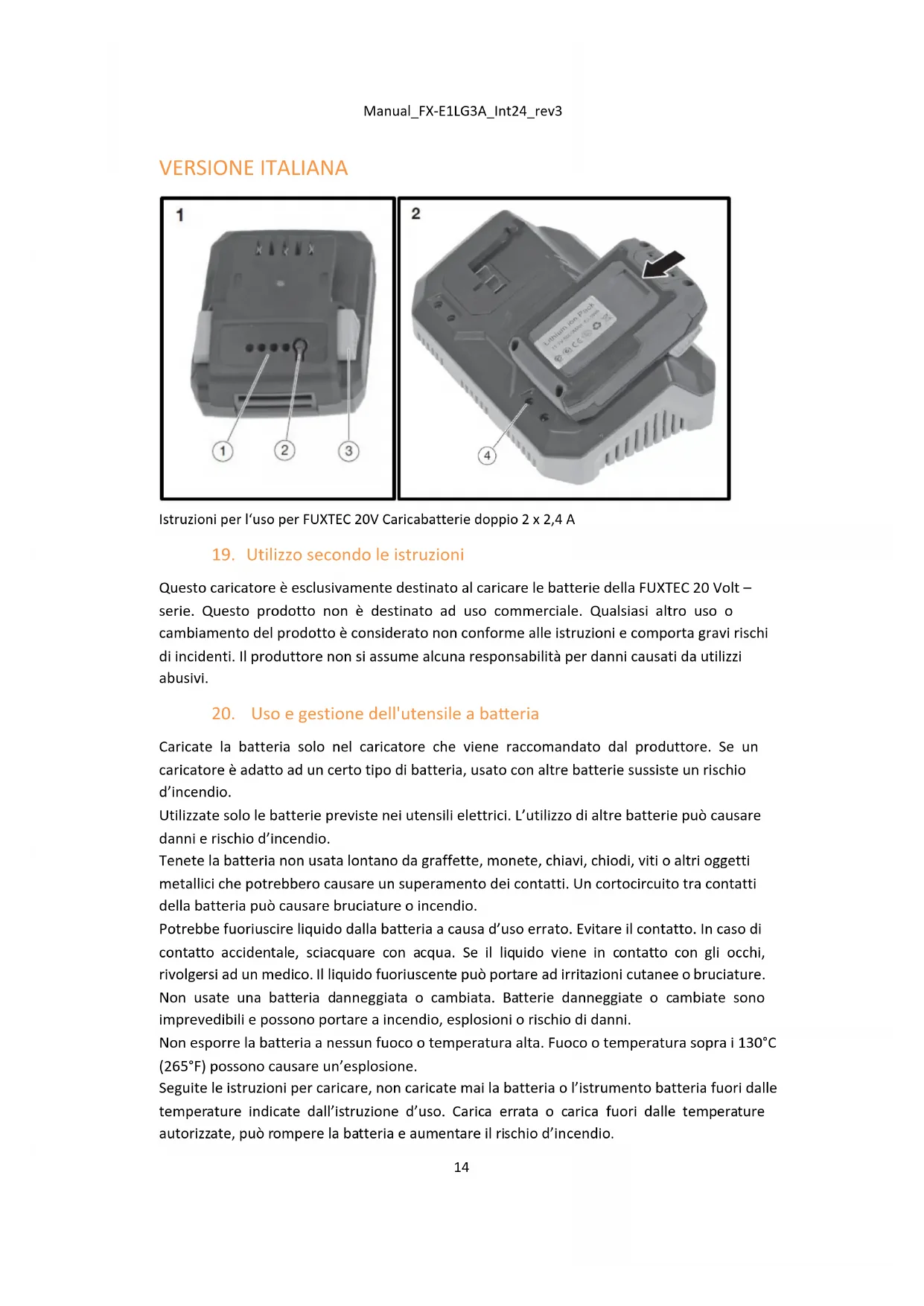 Caricate la batteria solo nel caricatore che viene raccomandato dal produttore. Se un caricatore è adatto ad un certo tipo di batteria, usato con altre batterie sussiste un rischio d’incendio. Utilizzate solo le batterie previste nei utensili elettrici. L’utilizzo di altre batterie può causare danni e rischio d’incendio. Tenete la batteria non usata lontano da graffette, monete, chiavi, chiodi, viti o altri oggetti metallici che potrebbero causare un superamento dei contatti. Un cortocircuito tra contatti della batteria può causare bruciature o incendio. Potrebbe fuoriuscire liquido dalla batteria a causa d’uso errato. Evitare il contatto. In caso di contatto accidentale, sciacquare con acqua. Se il liquido viene in contatto con gli occhi, rivolgersi ad un medico. Il liquido fuoriuscente può portare ad irritazioni cutanee o bruciature. Non usate una batteria danneggiata o cambiata. Batterie danneggiate o cambiate sono imprevedibili e possono portare a incendio, esplosioni o rischio di danni. Non esporre la batteria a nessun fuoco o temperatura alta. Fuoco o temperatura sopra i 130°C (265°F) possono causare un’esplosione. Seguite le istruzioni per caricare, non caricate mai la batteria o l’istrumento batteria fuori dalle temperature indicate dall’istruzione d’uso. Carica errata o carica fuori dalle temperature autorizzate, può rompere la batteria e aumentare il rischio d’incendio.Manual_FX-E1LG3A_Int24_rev3