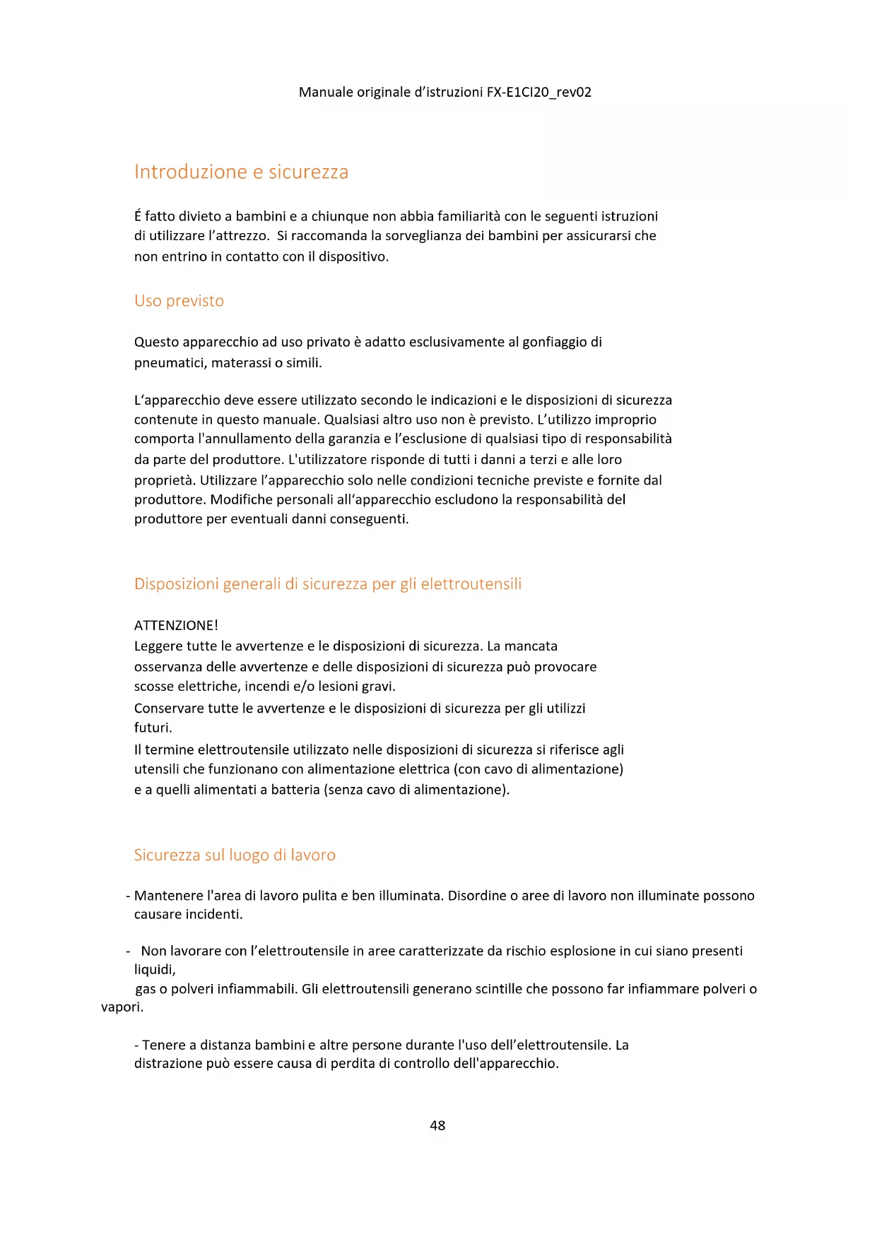 Disposizioni di sicurezza per i compressori a batteria Disposizioni generali di sicurezza - Per la propria sicurezza e quella altrui, leggere questo manuale e le relative disposizioni di sicurezza prima di utilizzare il dispositivo. Conservare le istruzioni per l'uso e le relative disposizioni di sicurezza per gli utilizzi futuri, avendole sempre a portata di mano. - In caso di cambio di proprietario, allegare le istruzioni d‘uso al dispositivo. - Le persone che utilizzano il dispositivo non devono essere sotto l'effetto di sostanze stupefacenti (es. alcool, droghe o medicinali). - Utilizzare il dispositivo secondo le condizioni tecniche prescritte e fornite dal produttore. Modifiche personali all‘apparecchio escludono la responsabilità del produttore per eventuali danni conseguenti. - Utilizzare il dispositivo solo in presenza di luce diurna o buona illuminazione artificiale. - Utilizzare l‘apparecchio solo in condizioni di umidità assente. Tenerlo al riparo da pioggia o umidità. Infiltrazioni d‘acqua nell’apparecchio aumentano il rischio di scosse elettriche.52 Manuale originale d’istruzioni FX-E1CI20_rev02