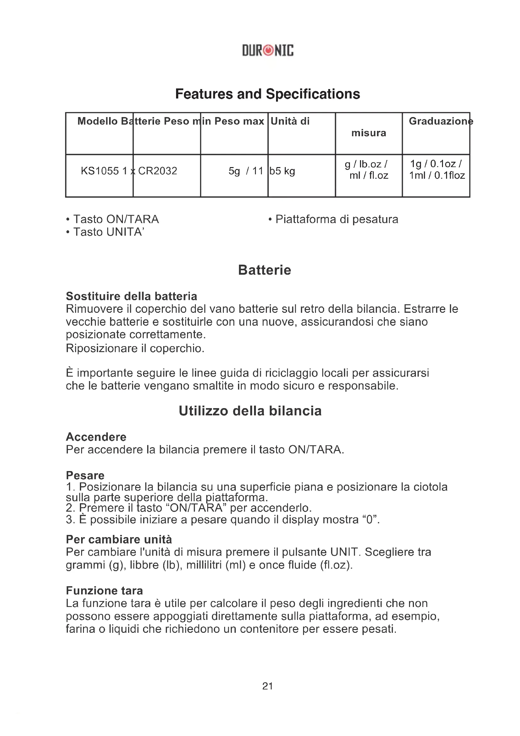 - Piattaforma di pesatura22 La funzione tara è utile per pesare diversi ingredienti nello stesso contenitore, ad esempio, una volta aggiunto il primo ingrediente da pesare, premere il tasto tara e la bilancia si azzererà, il che consente di pesare gli altri ingredienti. Spegnimnto automatic La bilancia si spegne automaticamente dopo 60 secondi di inattività. Spegnimento manuale È possibile spegnere manualmente la bilancia in qualsiasi momento tenendo premuto il pulsante ON/TARA per 2 secondi. Pulizia e manutenzione La bilancia deve essere posizionata su una superficie piana e asciutta. La bilancia non deve essere esposta ad umidità o immersa nell'acqua. Per pulire la bilancia, utilizzare un panno leggermente umido. Non utilizzare detergenti chimici o abrasivi per pulire la bilancia. Se si prevede di non utilizzare la bilancia per un lungo periodo, rimuovere le batterie prima di riporla. Batteria scarica Questo simbolo avvisa anticipatamente che la batteria si esaurirà presto. Batterie scariche Batterie scariche. È necessario sostituire le batterie Peso instabile Ciò significa che il peso non è stabilizzato. Sovraccarico Ciò significa che è stato superato il limite di peso massimo. Rimuovere alcuni ingredienti per evitare di danneggiare la bilancia.23 Questo prodotto è garantito per una durata determinata con il distributore a partire dalla data di acquisto contro ogni difetto derivante da difetti di fabbricazione o dei materiali. Questa garanzia non copre difetti o danni derivanti da installazione impropria, uso improprio o usura anomala del prodotto. L’apparecchio deve essere restituito nella sua confezione originale e accompagnato dalla ricevuta e deve essere stato utilizzato in modo corretto. È importante rispettare le istruzioni per l’uso e le precauzioni di sicurezza indicate di seguito. Inoltre, non possiamo garantire l’apparecchio se è stato modicato o riparato dall’acquirente o da terzi. 1 anno di garanzia da Shine-Mart Ltd, proprietari del marchio commerciale Duronic. NOTA: QUESTE DICHIARAZIONI NON INFLUISCONO SUI DIRITTI LEGALI DEL CONSUMATORE Questo prodotto è stato realizzato con le rigorose procedure del controllo qualità, e utilizzando materiali di altissima qualità, per garantire afdabilità e prestazioni eccellenti. Vi regalerà un servizio ottimo e a lungo termine, purchè venga opportunamente usata e mantenuta. Il prodotto è garantito per 1 anno dalla data di acquisto. Se sorge qualche difetto a causa di materiali difettosi o scarsa manodopera, il prodotto difettoso dovrà essere restituito al luogo originale di acquisto. Il rimborso o la sostituzione sono a discrezione dell’azienda. I prodotti Duronic offrono 1 anno di garanzia alle seguenti condizioni: