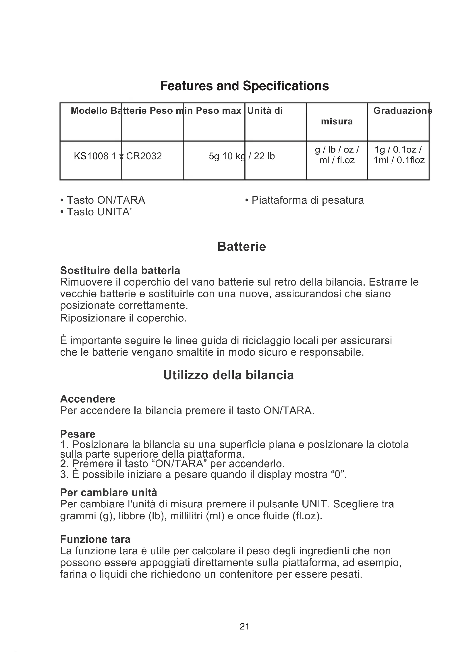 Per cambiare unità Per cambiare l'unità di misura premere il pulsante UNIT. Scegliere tra grammi (g), libbre (lb), millilitri (ml) e once fluide (fl.oz). Funzione tara La funzione tara è utile per calcolare il peso degli ingredienti che non possono essere appoggiati direttamente sulla piattaforma, ad esempio, farina o liquidi che richiedono un contenitore per essere pesati.