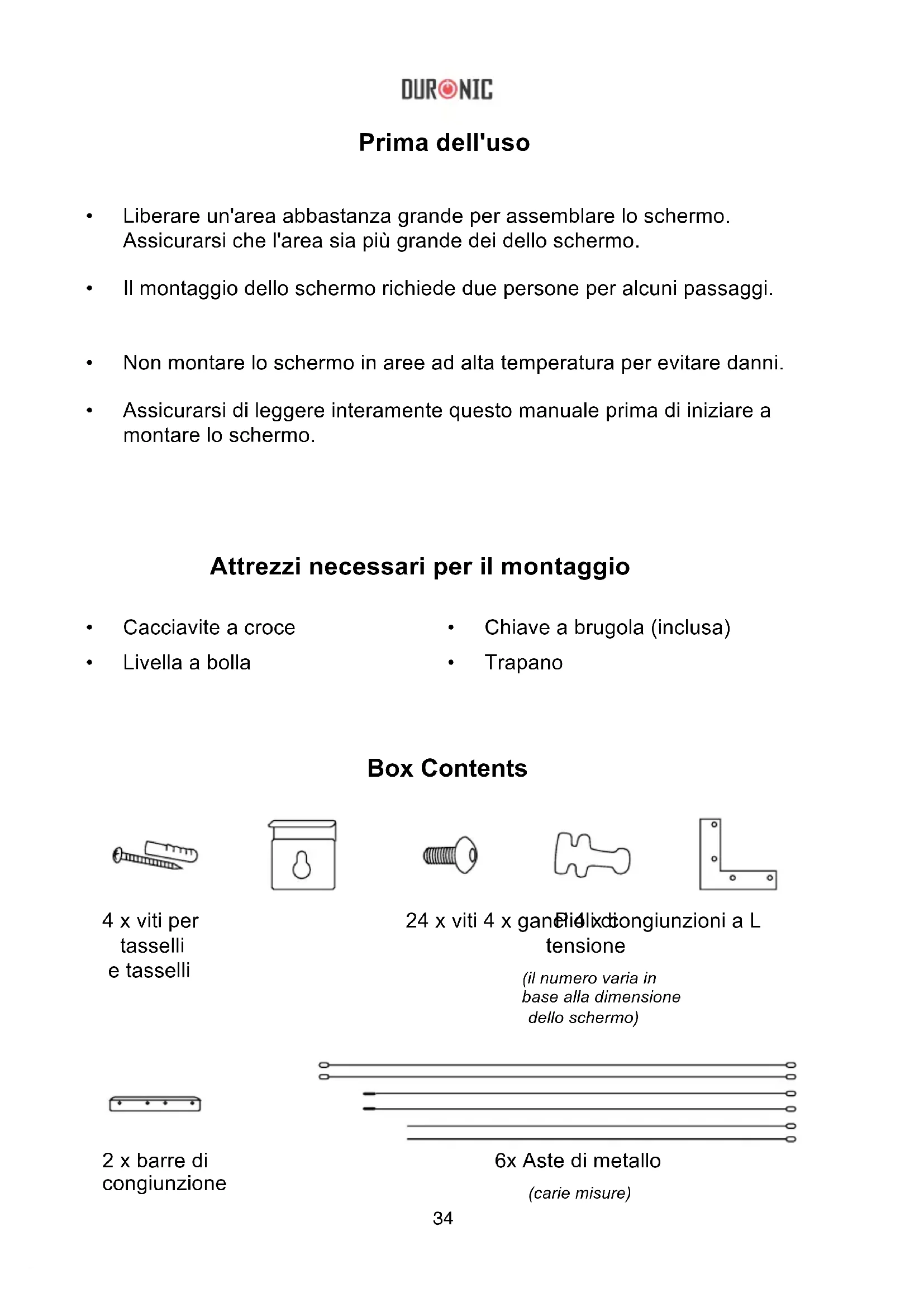 Non montare lo schermo in aree ad alta temperatura per evitare danni. Assicurarsi di leggere interamente questo manuale prima di iniziare a montare lo schermo. Box Contents