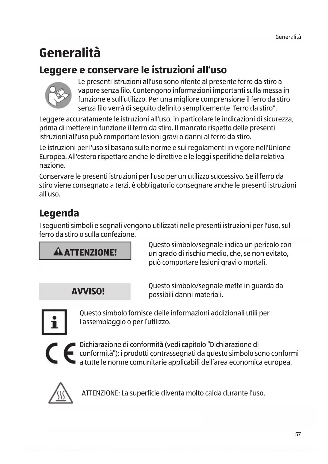 Generalità Leggere e conservare le istruzioni all‘uso Le presenti istruzioni all'uso sono riferite al presente ferro da stiro a vapore senza filo. Contengono informazioni importanti sulla messa in funzione e sull’utilizzo. Per una migliore comprensione il ferro da stiro senza filo verrà di seguito definito semplicemente "ferro da stiro". Leggere accuratamente le istruzioni all'uso, in particolare le indicazioni di sicurezza, prima di mettere in funzione il ferro da stiro. Il mancato rispetto delle presenti istruzioni all'uso può comportare lesioni gravi o danni al ferro da stiro. Le istruzioni per l'uso si basano sulle norme e sui regolamenti in vigore nell'Unione Europea. All'estero rispettare anche le direttive e le leggi specifiche della relativa nazione. Conservare le presenti istruzioni per l'uso per un utilizzo successivo. Se il ferro da stiro viene consegnato a terzi, è obbligatorio consegnare anche le presenti istruzioni all'uso. Legenda I seguenti simboli e segnali vengono utilizzati nelle presenti istruzioni per l'uso, sul ferro da stiro o sulla confezione. ATTENZIONE! Questo simbolo/segnale indica un pericolo con un grado di rischio medio, che, se non evitato, può comportare lesioni gravi o mortali. AVVISO! Questo simbolo/segnale mette in guarda da possibili danni materiali. Questo simbolo fornisce delle informazioni addizionali utili per l’assemblaggio o per l’utilizzo. Dichiarazione di conformità (vedi capitolo “Dichiarazione di conformità”): i prodotti contrassegnati da questo simbolo sono conformi a tutte le norme comunitarie applicabili dell’area economica europea. ATTENZIONE: La superficie diventa molto calda durante l'uso.Sicurezza