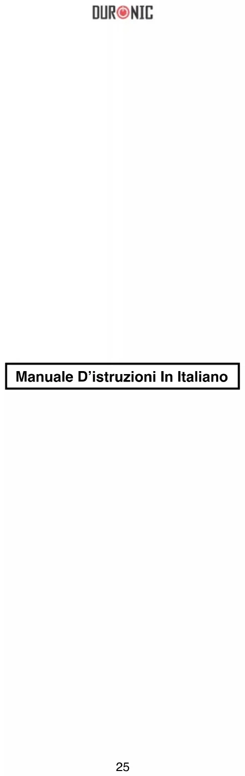 Questo prodotto è garantito per una durata determinata con il distributore a partire dalla data di acquisto contro ogni difetto derivante da difetti di fabbricazione o dei materiali. Questa garanzia non copre difetti o danni derivanti da installazione impropria, uso improprio o usura anomala del prodotto. L’apparecchio deve essere restituito nella sua confezione originale e accompagnato dalla ricevuta e deve essere stato utilizzato in modo corretto. È importante rispettare le istruzioni per l’uso e le precauzioni di sicurezza indicate di seguito. Inoltre, non possiamo garantire l’apparecchio se è stato modicato o riparato dall’acquirente o da terzi. 1 anno di garanzia da Shine-Mart Ltd, proprietari del marchio commerciale Duronic. NOTA: QUESTE DICHIARAZIONI NON INFLUISCONO SUI DIRITTI LEGALI DEL CONSUMATORE Questo prodotto è stato realizzato con le rigorose procedure del controllo qualità, e utilizzando materiali di altissima qualità, per garantire afdabilità e prestazioni eccellenti. Vi regalerà un servizio ottimo e a lungo termine, purchè venga opportunamente usata e mantenuta. Il prodotto è garantito per 1 anno dalla data di acquisto. Se sorge qualche difetto a causa di materiali difettosi o scarsa manodopera, il prodotto difettoso dovrà essere restituito al luogo originale di acquisto. Il rimborso o la sostituzione sono a discrezione dell’azienda. I prodotti Duronic offrono 1 anno di garanzia alle seguenti condizioni: