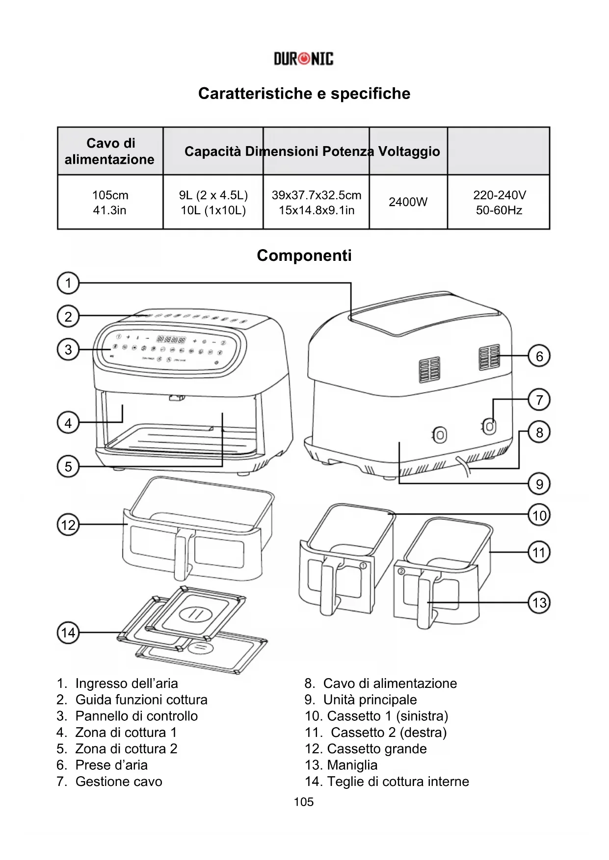 Cavo di alimentazione Capacità Dimensioni Potenza Voltaggio 105cm 41.3in 9L (2 x 4.5L) 10L (1x10L) 39x37.7x32.5cm 15x14.8x9.1in 2400W 220-240V 50-60Hz106 Nome Modello Componenti AF14