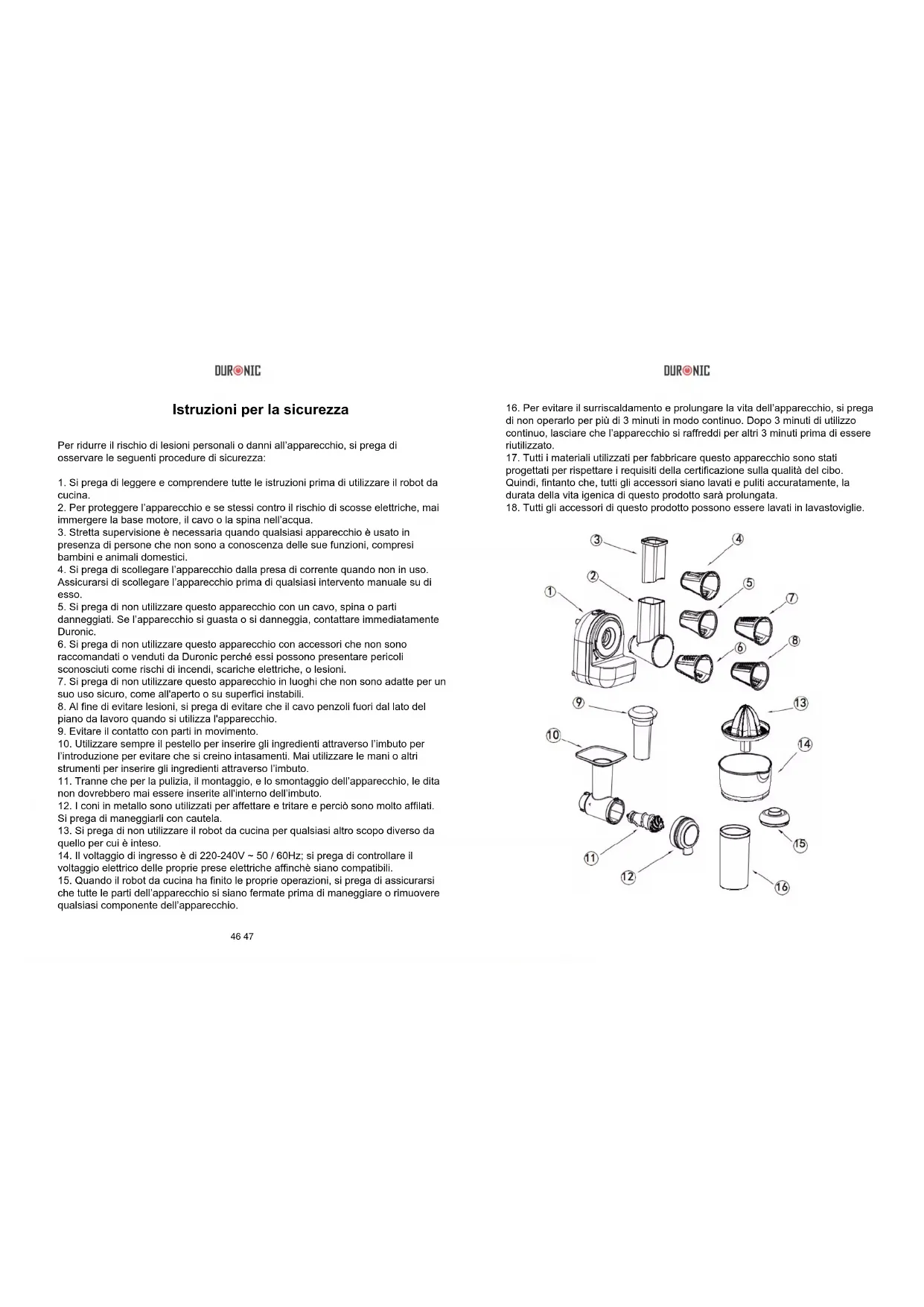 semi e la polpa della frutta mentre il succo verrà raccolto nella bacinella. Pulizia Non immergere mai il corpo motore in acqua o altri liquidi. Per la pulizia, utilizzare un panno umido e asciugare successivamente con un panno asciutto. Tutti le altre parti possono essere pulite con una spazzola morbida. Tutti gli accessori del prodotto possono essere lavati in lavastoviglie.52 53 Questo prodotto è garantito per una durata determinata con il distributore a partire dalla data di acquisto contro ogni difetto derivante da difetti di fabbricazione o dei materiali. Questa garanzia non copre difetti o danni derivanti da installazione impropria, uso improprio o usura anomala del prodotto. L’apparecchio deve essere restituito nella sua confezione originale e accompagnato dalla ricevuta e deve essere stato utilizzato in modo corretto. È importante rispettare le istruzioni per l’uso e le precauzioni di sicurezza indicate di seguito. Inoltre, non possiamo garantire l’apparecchio se è stato modicato o riparato dall’acquirente o da terzi. 1 anno di garanzia da Shine-Mart Ltd, proprietari del marchio commerciale Duronic. NOTA: QUESTE DICHIARAZIONI NON INFLUISCONO SUI DIRITTI LEGALI DEL CONSUMATORE Questo prodotto è stato realizzato con le rigorose procedure del controllo qualità, e utilizzando materiali di altissima qualità, per garantire afdabilità e prestazioni eccellenti. Vi regalerà un servizio ottimo e a lungo termine, purchè venga opportunamente usata e mantenuta. Il prodotto è garantito per 1 anno dalla data di acquisto. Se sorge qualche difetto a causa di materiali difettosi o scarsa manodopera, il prodotto difettoso dovrà essere restituito al luogo originale di acquisto. Il rimborso o la sostituzione sono a discrezione dell’azienda. I prodotti Duronic offrono 1 anno di garanzia alle seguenti condizioni: