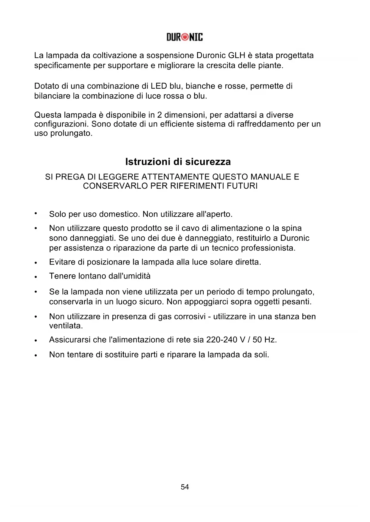 La lampada da coltivazione a sospensione Duronic GLH è stata progettata specificamente per supportare e migliorare la crescita delle piante. Dotato di una combinazione di LED blu, bianche e rosse, permette di bilanciare la combinazione di luce rossa o blu. Questa lampada è disponibile in 2 dimensioni, per adattarsi a diverse configurazioni. Sono dotate di un efficiente sistema di raffreddamento per un uso prolungato. Solo per uso domestico. Non utilizzare all'aperto. Non utilizzare questo prodotto se il cavo di alimentazione o la spina sono danneggiati. Se uno dei due è danneggiato, restituirlo a Duronic per assistenza o riparazione da parte di un tecnico professionista. Evitare di posizionare la lampada alla luce solare diretta. Tenere lontano dall'umidità Se la lampada non viene utilizzata per un periodo di tempo prolungato, conservarla in un luogo sicuro. Non appoggiarci sopra oggetti pesanti. Non utilizzare in presenza di gas corrosivi - utilizzare in una stanza ben ventilata. Assicurarsi che l'alimentazione di rete sia 220-240 V / 50 Hz. Non tentare di sostituire parti e riparare la lampada da soli. SI PREGA DI LEGGERE ATTENTAMENTE QUESTO MANUALE E