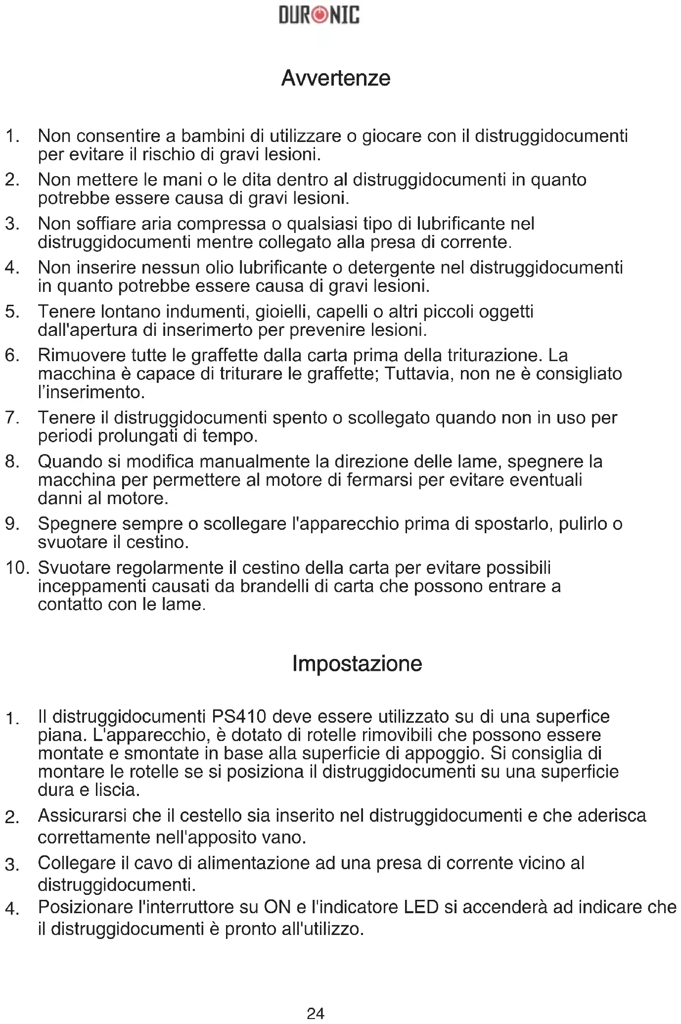 Il distruggidocumenti è pronto per essere usato. Tipo di taglio: Dimensioni taglio: Capacità di tritatura: Lunghezza apertura: Peso: Input: Microtaglio 4 x 10mm 8 fogli 220mm 6.4kgs 230-240VAC, 50Hz27 Questo prodotto è garantito per una durata determinata con il distributore a partire dalla data di acquisto contro ogni difetto derivante da difetti di fabbricazione o dei materiali. Questa garanzia non copre difetti o danni derivanti da installazione impropria, uso improprio o usura anomala del prodotto. L’apparecchio deve essere restituito nella sua confezione originale e accompagnato dalla ricevuta e deve essere stato utilizzato in modo corretto. È importante rispettare le istruzioni per l’uso e le precauzioni di sicurezza indicate di seguito. Inoltre, non possiamo garantire l’apparecchio se è stato modicato o riparato dall’acquirente o da terzi. 1 anno di garanzia da Shine-Mart Ltd, proprietari del marchio commerciale Duronic. NOTA: QUESTE DICHIARAZIONI NON INFLUISCONO SUI DIRITTI LEGALI DEL CONSUMATORE Questo prodotto è stato realizzato con le rigorose procedure del controllo qualità, e utilizzando materiali di altissima qualità, per garantire afdabilità e prestazioni eccellenti. Vi regalerà un servizio ottimo e a lungo termine, purchè venga opportunamente usata e mantenuta. Il prodotto è garantito per 1 anno dalla data di acquisto. Se sorge qualche difetto a causa di materiali difettosi o scarsa manodopera, il prodotto difettoso dovrà essere restituito al luogo originale di acquisto. Il rimborso o la sostituzione sono a discrezione dell’azienda. I prodotti Duronic offrono 1 anno di garanzia alle seguenti condizioni: