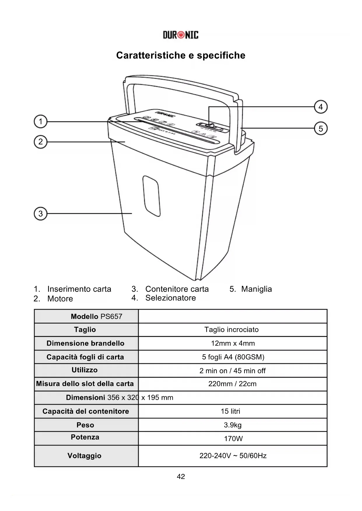 Scarica le istruzioni per il tuo Distruggi documenti in formato PDF gratuitamente! Trova il tuo manuale PS657 - Duronic e riprendi in mano il tuo dispositivo elettronico. In questa pagina sono pubblicati tutti i documenti necessari per l'utilizzo del tuo dispositivo. PS657 del marchio Duronic.