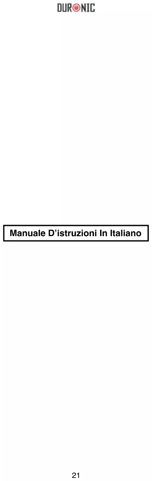 Sostituire con la nuova lampada e richiudere la griglia. Griglia di protezione posteriore Cover interna Accensione Cavo di alimentazione Trasformatore Vaschetta Griglia di protezione anteriore Cover esterna Alta tensione grig lia Cover interna Con nettore Tubi Cover esterna24 Questo prodotto è garantito per una durata determinata con il distributore a partire dalla data di acquisto contro ogni difetto derivante da difetti di fabbricazione o dei materiali. Questa garanzia non copre difetti o danni derivanti da installazione impropria, uso improprio o usura anomala del prodotto. L’apparecchio deve essere restituito nella sua confezione originale e accompagnato dalla ricevuta e deve essere stato utilizzato in modo corretto. È importante rispettare le istruzioni per l’uso e le precauzioni di sicurezza indicate di seguito. Inoltre, non possiamo garantire l’apparecchio se è stato modicato o riparato dall’acquirente o da terzi. 1 anno di garanzia da Shine-Mart Ltd, proprietari del marchio commerciale Duronic. NOTA: QUESTE DICHIARAZIONI NON INFLUISCONO SUI DIRITTI LEGALI DEL CONSUMATORE Questo prodotto è stato realizzato con le rigorose procedure del controllo qualità, e utilizzando materiali di altissima qualità, per garantire afdabilità e prestazioni eccellenti. Vi regalerà un servizio ottimo e a lungo termine, purchè venga opportunamente usata e mantenuta. Il prodotto è garantito per 1 anno dalla data di acquisto. Se sorge qualche difetto a causa di materiali difettosi o scarsa manodopera, il prodotto difettoso dovrà essere restituito al luogo originale di acquisto. Il rimborso o la sostituzione sono a discrezione dell’azienda. I prodotti Duronic offrono 1 anno di garanzia alle seguenti condizioni:
