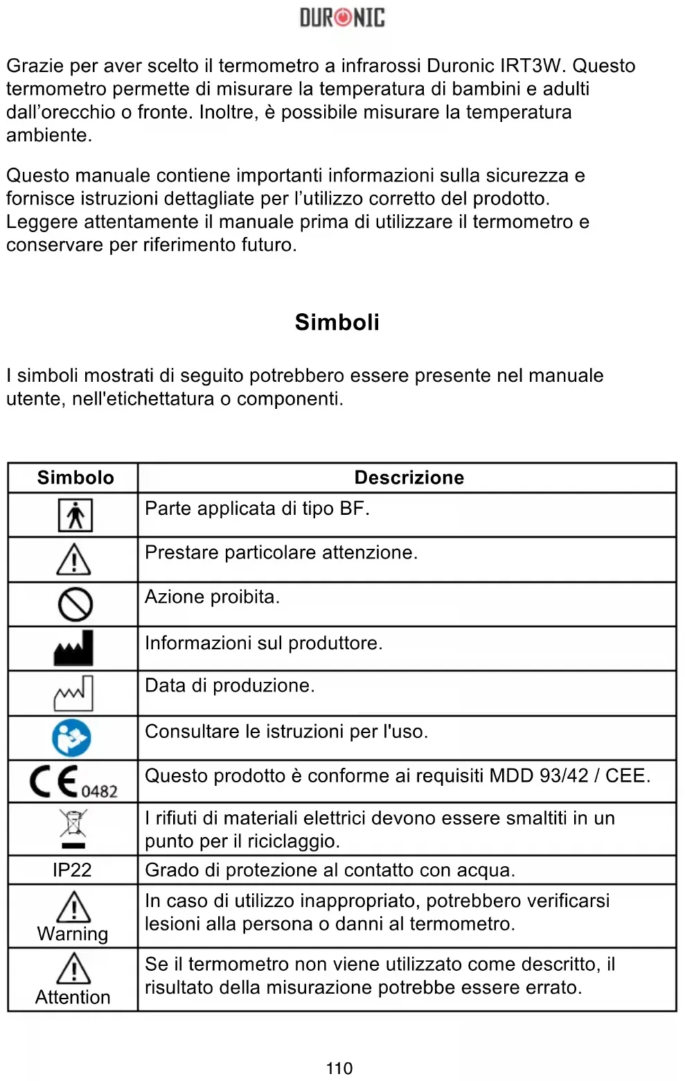 Si consiglia di disinfettare il termometro prima e dopo ogni utilizzo. Il tempo di disinfezione viene completato in 1 minuto. Pulire e disinfettare il termomentro ad una temperatura di +10ºC~+40ºC (50ºF-104ºF), tasso di umidità di 15%~85%RH (senza condenza) e la pressione barometrica di 86kPa~106kPa. Non utilizzare vapore caldo o radiazioni ultraviolette per la disinfezione. Il termometro potrebbe essere danneggiato. Rimuovere le batterie se il termometro non verrà utilizzato per più di due mesi.130 Risoluzione dei problemi Possible Causa Assicurarsi che le batterie sono posizionate correttamente. La temperatura ambiente è più bassa di 10 ° C (50,0 ° F) o superiore a 40 ° C (104 ° F). Effettuare una misurazione in un ambient di temperatura tra 10 ° C (50,0 ° F) e 40 ° C (104 ° F). Il termometro viene utilizzato dopo essere stato conservato in un ambiente freddo. Attendere 30 minuti, fino a che il termometro avrà raggiunto la temperatura ambiente. Problema Il termometro non si accende. Viene visualizzato "Er1". La lettura della temperatura è inferiore alla temperatura corporea tipico. La lettura è più alta rispetto alla tipica temperatura corporea. Batteria scarica Polarità del le batterie sono invertite. Il termometro è danneggiato. L'obiettivo della sonda di temperatura è sporco. La sonda del termometro non è allineata al timpano. La sonda di temperatura è danneggiata. Soluzione Cambiare le batterie. Contatta il produttore. Pulire l'obiettivo usando un batuffolo di cotone. Riposizionare la sonda termometro così che è allineata al timpano. Contatta Duronic.131 Grado di protezione contro le scosse elettriche parte applicata di tipo BF.