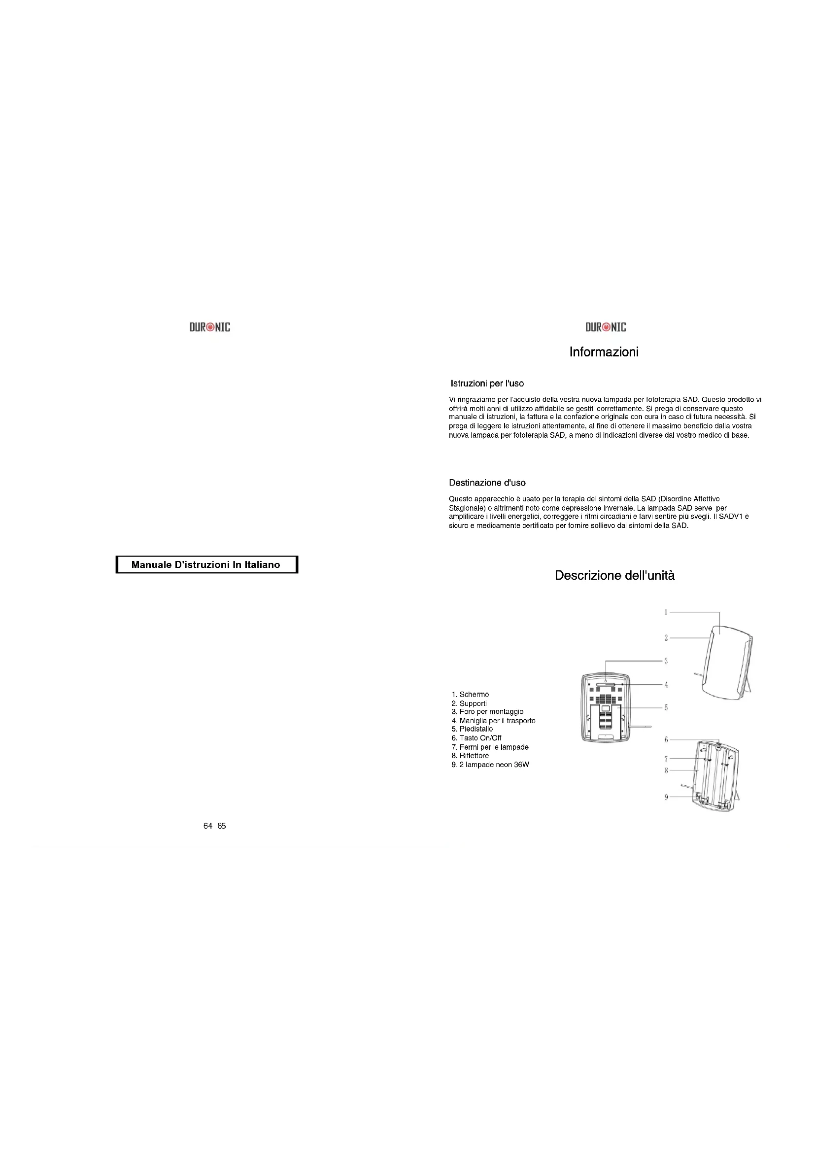 Manuale D'istruzioni In Italiano Descrizione dell'unità Informazioni Istruzioni per l'uso Vi ringraziamo per l'acquisto della vostra nuova lampada per fototerapia SAD. Questo prodotto vi offrirà molti anni di utilizzo affidabile se gestiti correttamente. Si prega di conservare questo manuale di istruzioni, la fattura e la confezione originale con cura in caso di futura necessità. Si prega di leggere le istruzioni attentamente, al fine di ottenere il massimo beneficio dalla vostra nuova lampada per fototerapia SAD, a meno di indicazioni diverse dal vostro medico di base. Destinazione d'uso Questo apparecchio è usato per la terapia dei sintomi della SAD (Disordine Affettivo Stagionale) o altrimenti noto come depressione invernale. La lampada SAD serve per amplificare i livelli energetici, correggere i ritmi circadiani e farvi sentire più svegli. Il SADV1 è sicuro e medicamente certificato per fornire sollievo dai sintomi della SAD.