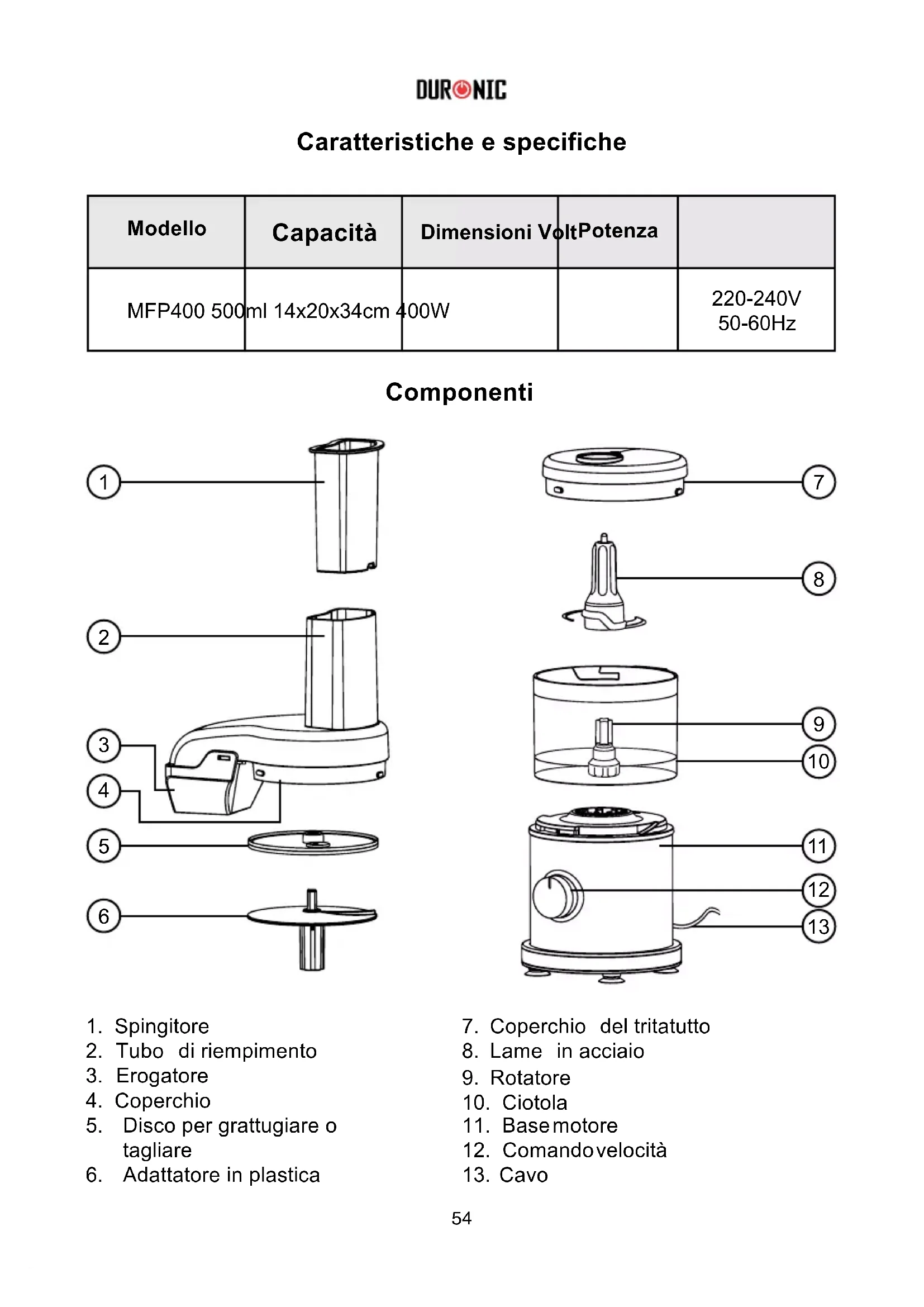 velocità Cavo Dimensioni Volt MFP400 500ml 14x20x34cm 400W 220-240V 50-60Hz Modello Capacità Potenza55