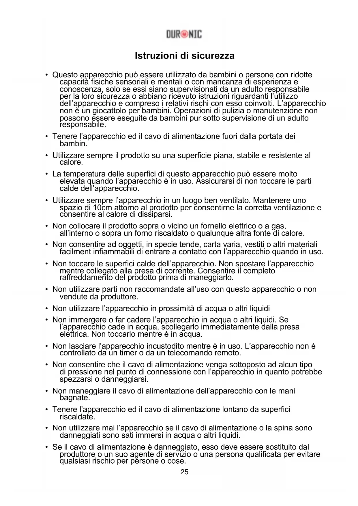 condizioni Per parti di ricambio si prega di consultare il sito www.duronic.com Corretto smaltimento del prodotto. Qusto prodotto è inclusivo di spina certicata CEimportata da Shine-Mart Ltd, RM3 8SB Questo segno su un prodotto o su documenti indica che quando deve essere smaltito, deve essere trattato come i riuti elettrici ed elettronici (WEEE) Tutti I prodotti marcati WEEE non devono essere buttati nei riuti domenistici generici, ma separati per il trattamento, il recupero e il riciclaggio dei materiali utilizzati. Per un corretto trattamento, recupero e riciclaggio; si prega di portare tutti I prodotti marcati WEEE al Vostro centro smaltimenti riuti autorizzato, dove saranno accettati gratuitamente. Se i consumatori sono propensi allo smaltimento corretto di riuti elettrici ed elettronici, aiuteranno a salvare risorse importanti e a prevenire i potenziali effetti negativi sulla salute umana e sull’ambiente di tutti i materiali pericolosi che i riuti possono contenere. Garanzia Seguici29 Instrukcja obsługi. Polski30 Bezpieczeństwo użytkowania
