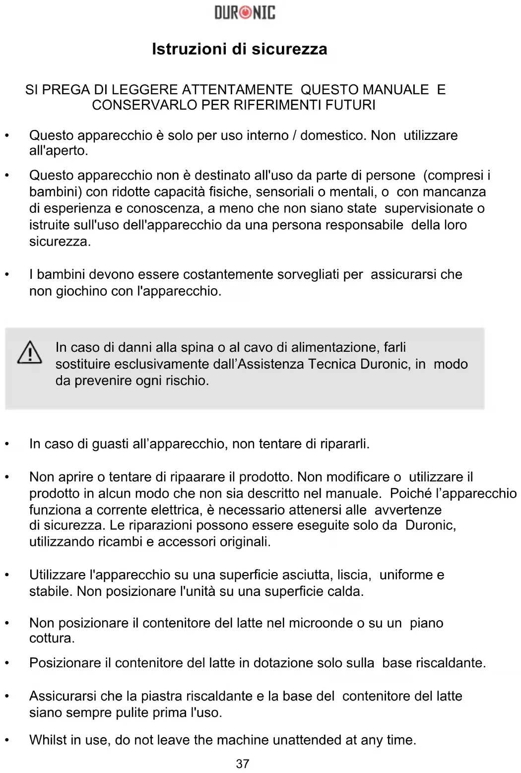 Posizionare il contenitore del latte in dotazione solo sulla base riscaldante. Assicurarsi che la piastra riscaldante e la base del contenitore del latte siano sempre pulite prima l'uso. In caso di danni alla spina o al cavo di alimentazione, farli sostituire esclusivamente dall’Assistenza Tecnica Duronic, in modo da prevenire ogni rischio. SI PREGA DI LEGGERE ATTENTAMENTE QUESTO MANUALE E