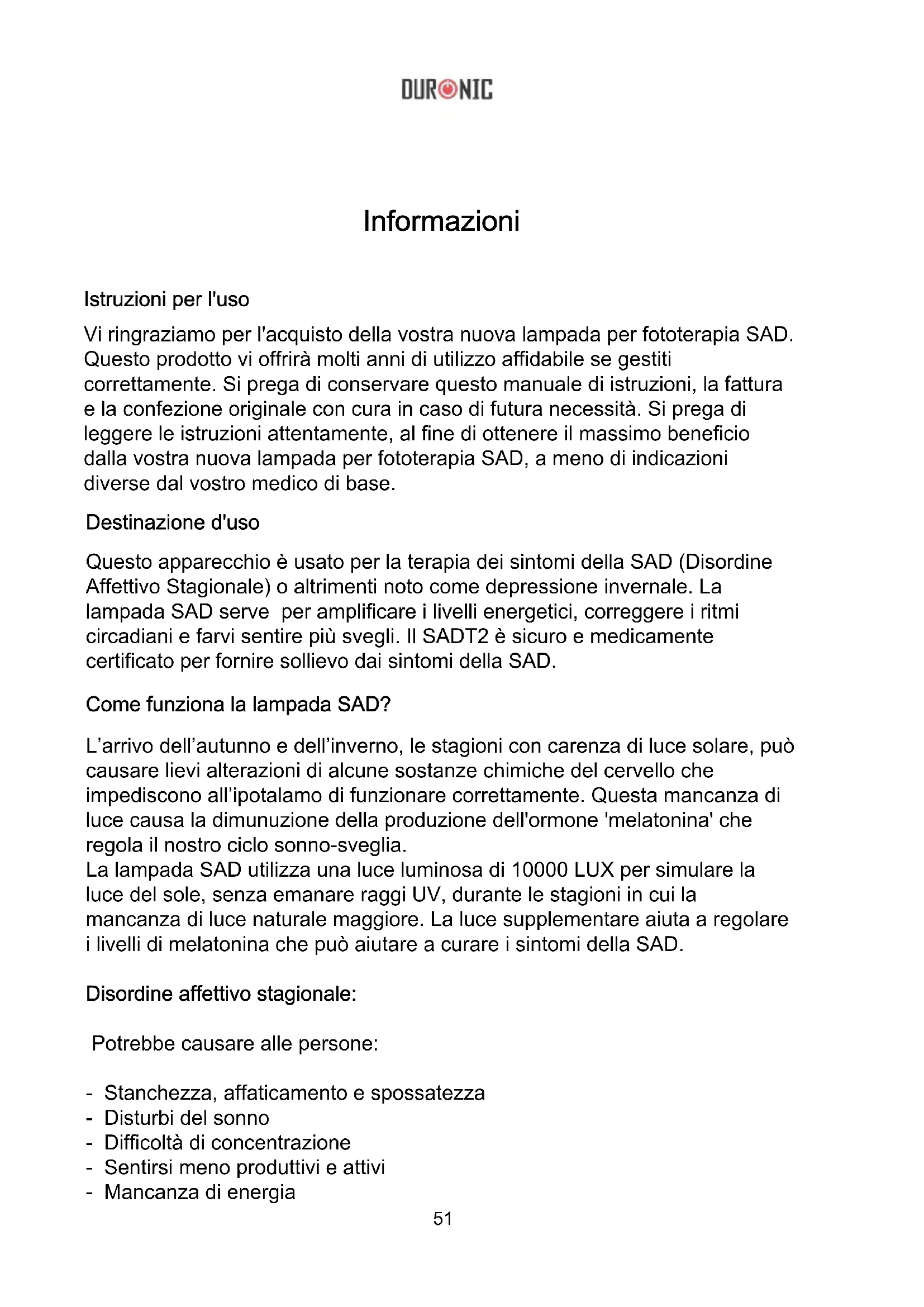 Spegnimento Premere il pulsante ON/OFF dell'apparecchio per 3 volte per spegnere la lampada.59 FAQ Per qualsiasi altra domanda, si prega di visitare www.duronic.com Problema Possibili cause Soluzioni L’apparecc hio non si accende L’apparecchio è spento Accendere l’apparecchio Non c’è corrente Collegare correttamente la spina principale. Il cavo di alimentazione è difettoso. Contattare il servizio clienti o il vostro rivenditore. Le lampade LED hanno esaurito la loro durata Se è necessario cambiare i led contattare il servizio clienti o un rivenditore autorizzato. LED difettosi60 Specifiche tecniche Modello SADT2 Dimensioni 260 x 150 x 17mm Peso 500g Lampade LEDs Potenza DC12V, 1A Intensità luminosa > 10,000 lux a 10 cm Presa di corrente 12V DC, 1.0 a, solo con adattatore modelli CS12F120100FGF o CS12F120100FBF Ambiente operativo 0 to +40 oC, and 30% to 90% relative humidity Atmospheric pressure: 700-1060hPa Ambiente di conservazione da -10 a + 60 oC e 30% a 90% relativo umidità Pressione atmosferica: 700-1060 hPa Ambiente di trasporto da -10 a + 60 oC e 30% a 90% umidità relativa Pressione atmosferica: 700-1060 hPa Classificazione del prodotto