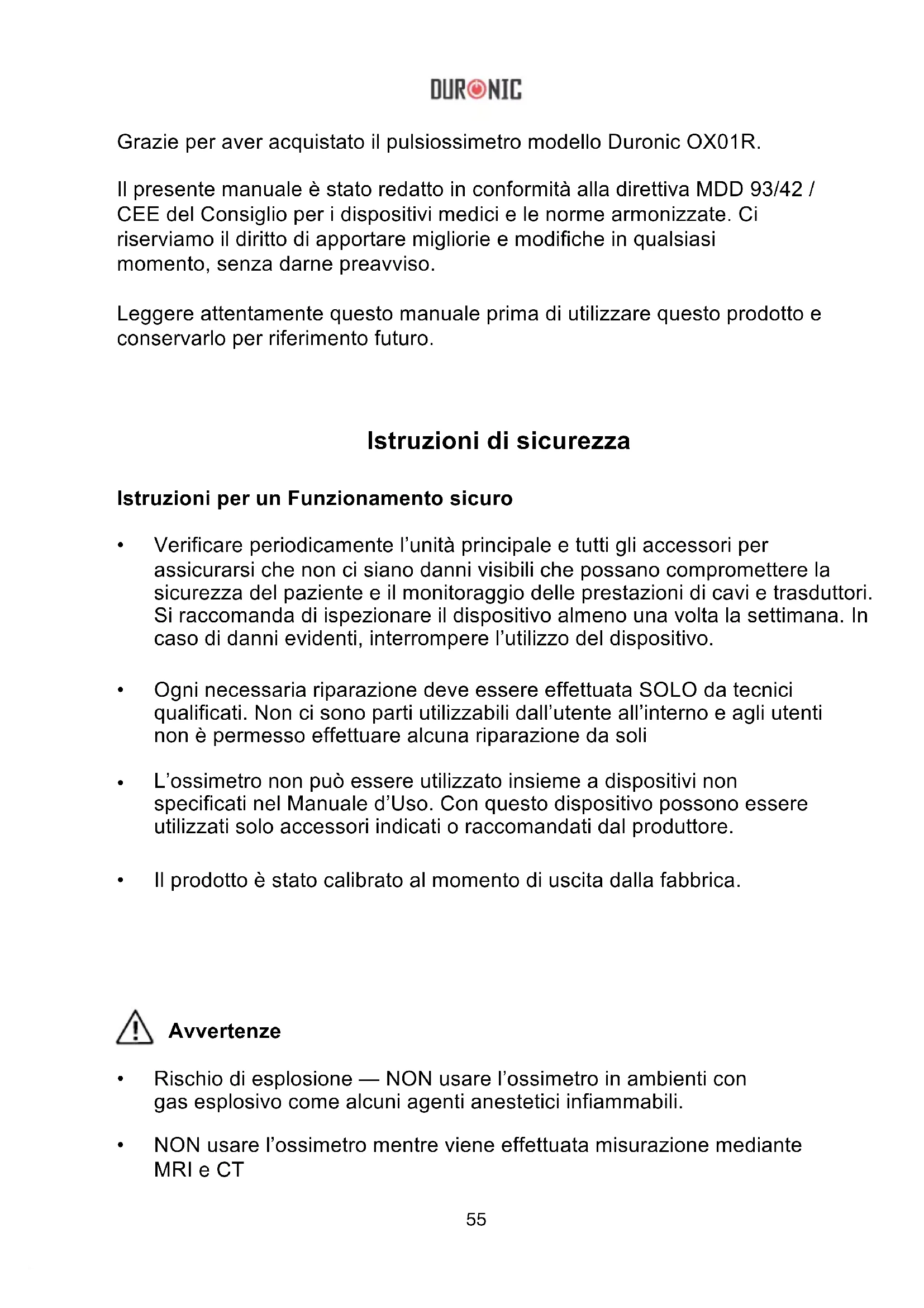 Grazie per aver acquistato il pulsiossimetro modello Duronic OX01R. Leggere attentamente questo manuale prima di utilizzare questo prodotto e conservarlo per riferimento futuro. Istruzioni di sicurezza Rischio di esplosione — NON usare l’ossimetro in ambienti con gas esplosivo come alcuni agenti anestetici infiammabili.