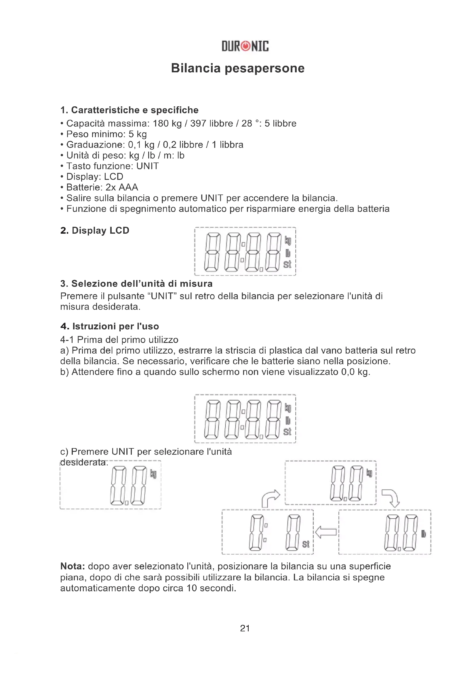 4-1 Prima del primo utilizzo a) Prima del primo utilizzo, estrarre la striscia di plastica dal vano batteria sul retro della bilancia. Se necessario, verificare che le batterie siano nella posizione. b) Attendere fino a quando sullo schermo non viene visualizzato 0,0 kg. c) Premere UNIT per selezionare l'unità desiderata. Nota: dopo aver selezionato l'unità, posizionare la bilancia su una superficie piana, dopo di che sarà possibili utilizzare la bilancia. La bilancia si spegne automaticamente dopo circa 10 secondi.22 4-2 Misurazione del peso a) Posizionare la bilancia su una superficie piana. b) Salire sulla bilancia per accendere la bilancia. c) Scendere dalla bilancia e attendi che sul display venga visualizzato 0.0. 5-2 Indicazione di sovraccarico. Quando viene visualizzato "Err", rimuovere il peso dalla bilancia per proteggere i sensori.