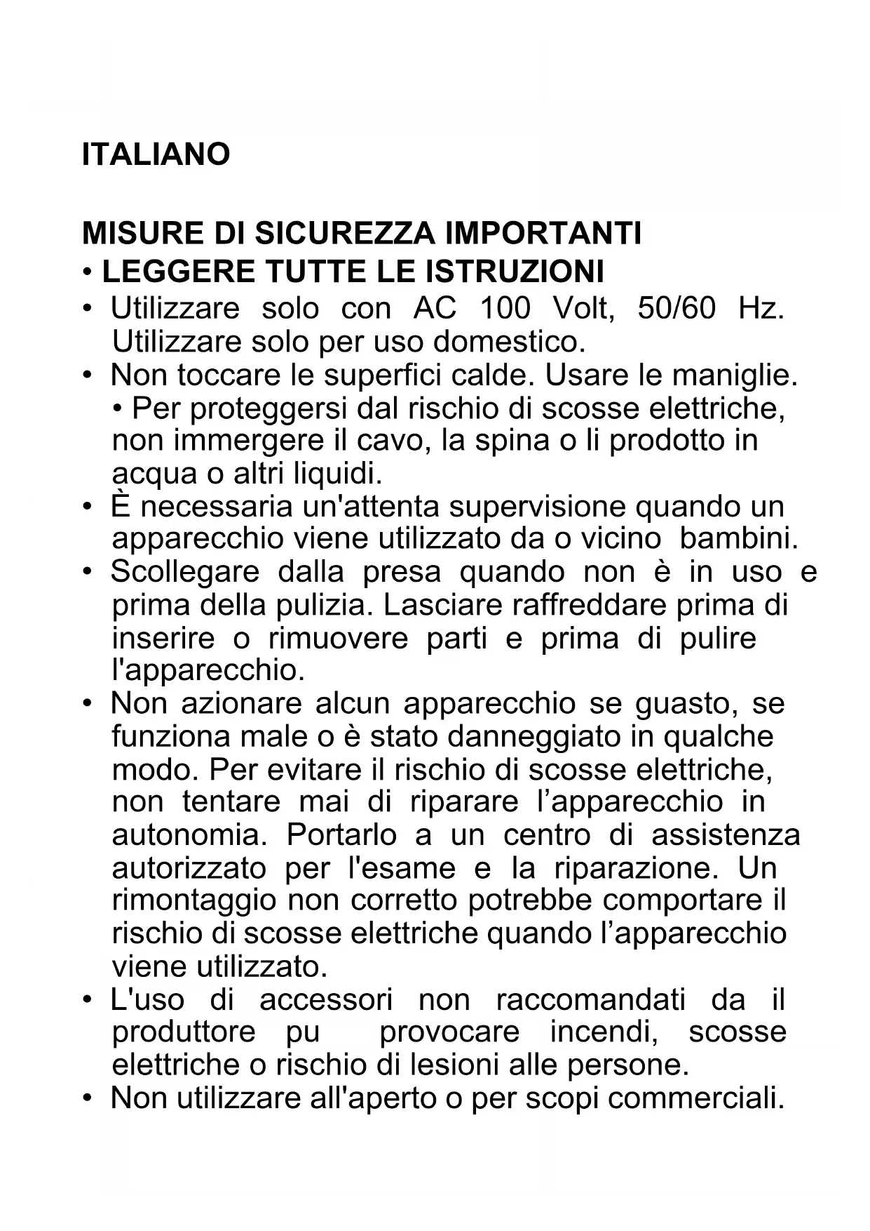 - Conservare l'apparecchio e il cavo di alimentazione fuori dalla portata di bambini di età inferiore a 8 anni.• Quando si utilizzano apparecchiature elettriche, è necessario adottare sempre misure di sicurezza per prevenire il rischio di incendi, scosse elettriche e/o lesioni in caso di uso improprio.
